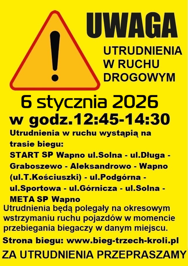 Ten bieg odbędzie się w najbliższy wtorek w Wapnie. Utrudnienia będą polegały na okresowym wstrzymaniu ruchu pojazdów w momencie pojawienie się biegaczy w danym miejscu.