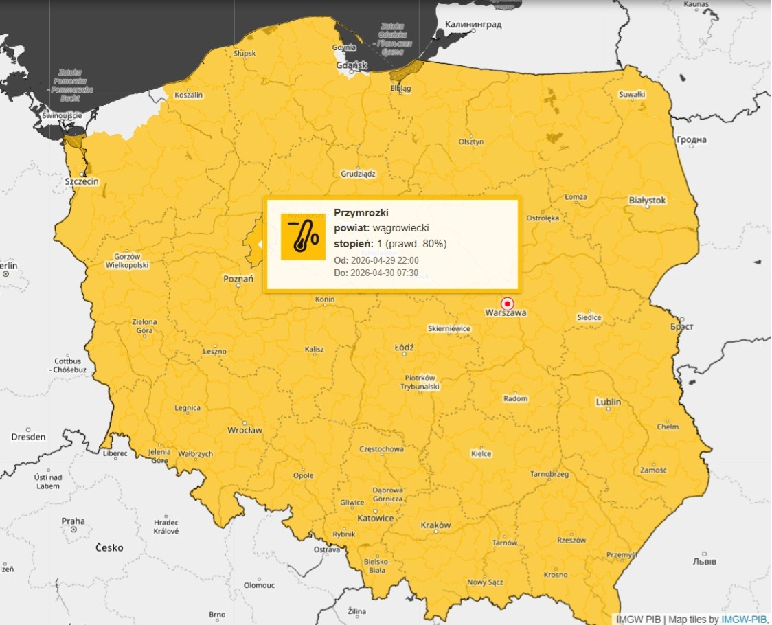Ostrzeżenie jest pierwszego stopnia i obowiązuje najbliższej nocy, od godz. 22.00 w środę 29 kwietnia, do godziny 7.30 jutrzejszego dnia, czwartek 30 kwietnia.