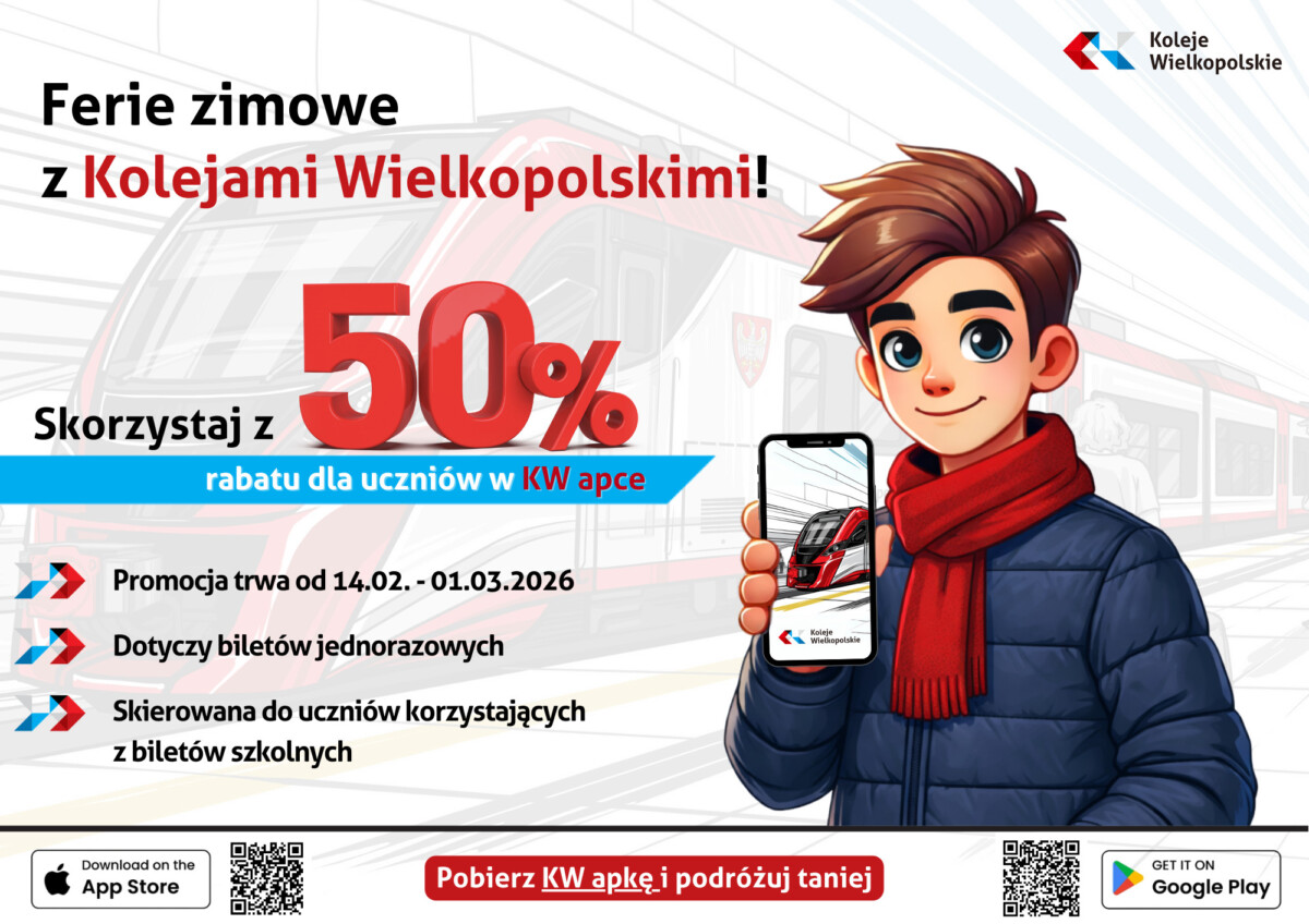 Promocja obowiązuje wyłącznie w aplikacji KW apka. To doskonała okazja, aby taniej podróżować w czasie ferii — odwiedzić rodzinę, wyjechać na zimowy wypoczynek lub spotkać się ze znajomymi.
