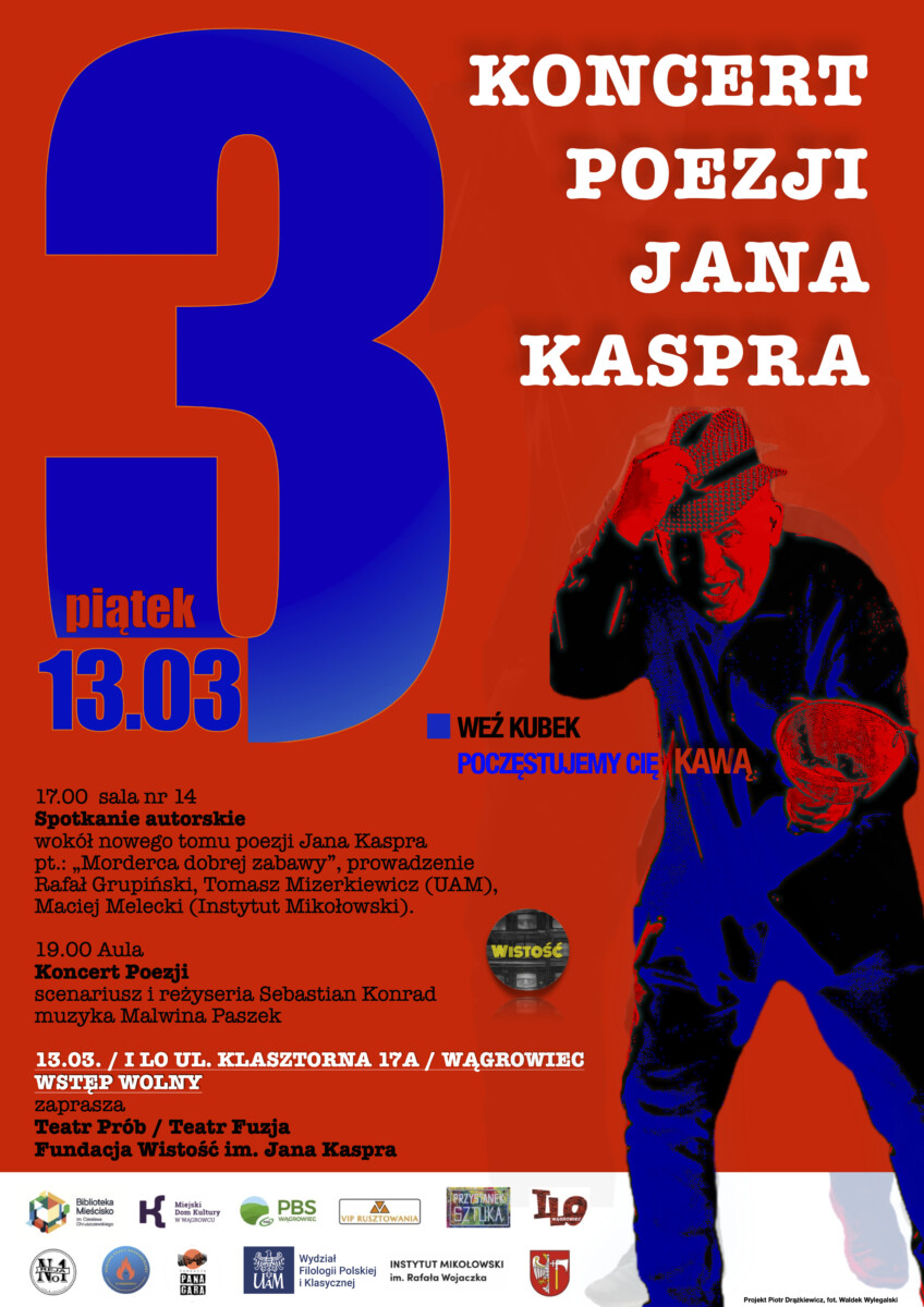 – W I Liceum Ogólnokształcącym przy ul. Klasztornej 17A odbędzie się III Koncert Poezji Jana Kaspra – spotkanie łączące literaturę, muzykę i rozmowę o współczesnej poezji – wyjaśniają organizatorzy, czyli Teatr Prób/Teatr Fuzja oraz Fundacja Wistość im. Jana Kaspra, którzy zapraszają mieszkańców Wągrowca i miłośników literatury na wieczór, który pozwoli nie tylko wsłuchać się w poezję, ale także spotkać osoby współtworzące współczesne życie literackie.