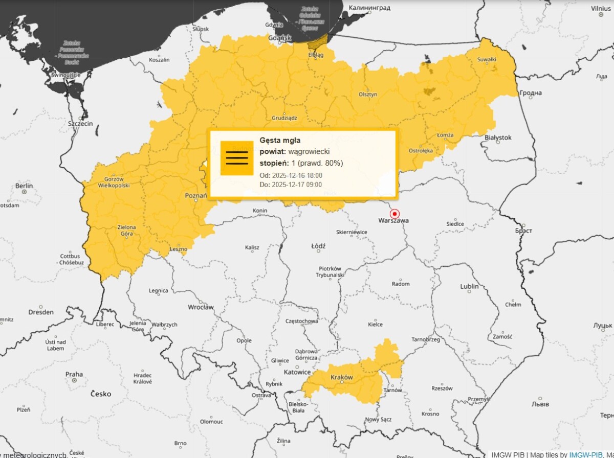 Ostrzeżenie pierwszego stopnia zacznie obowiązywać dzisiaj, czyli we wtorek 16 grudnia, od godziny 18.00 do godziny 9.00 w środę 17 grudnia. Prawdopodobieństwo wystąpienia zjawiska zostało określone na 80 procent.