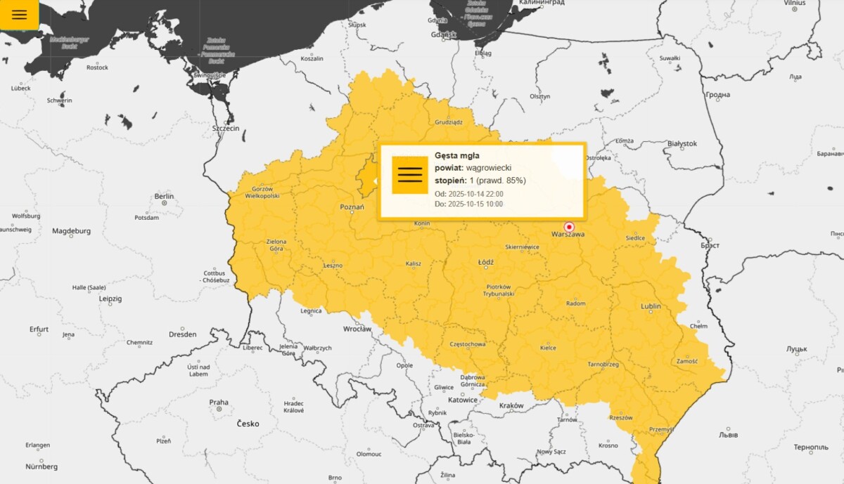 Ostrzeżenie pierwszego stopnia zacznie obowiązywać dzisiaj, czyli we wtorek 14 października, od godziny 22.00 do jutra, środa 15 października, do godziny 10.00. Prawdopodobieństwo wystąpienia zjawiska zostało określone na 85 procent.