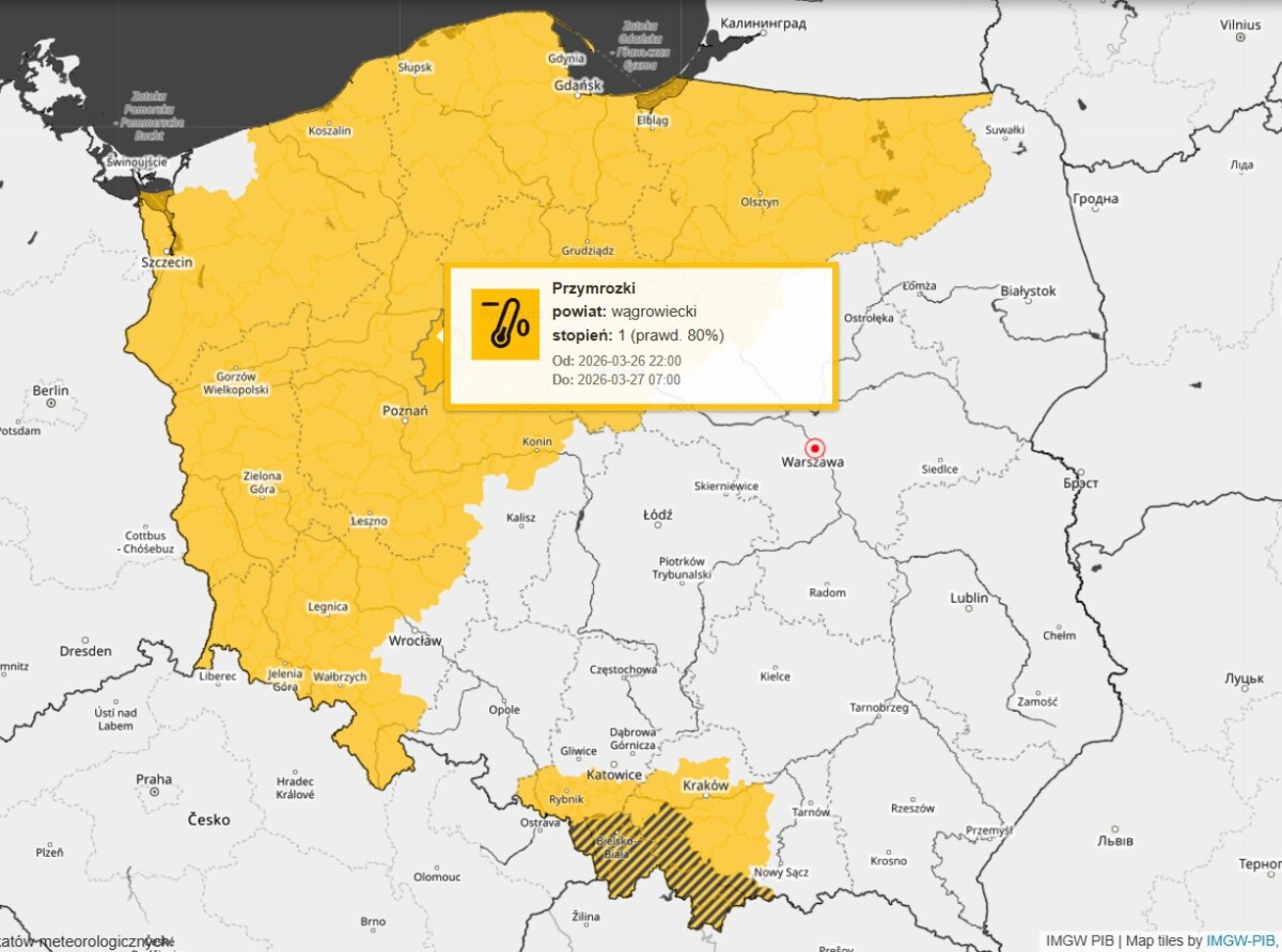 Ostrzeżenie jest pierwszego stopnia i obowiązuje od dzisiejszego wieczora, od czwartku 26 marca, godzina 22.00 do piątkowego poranka 27 marca, do godziny 7.00.
