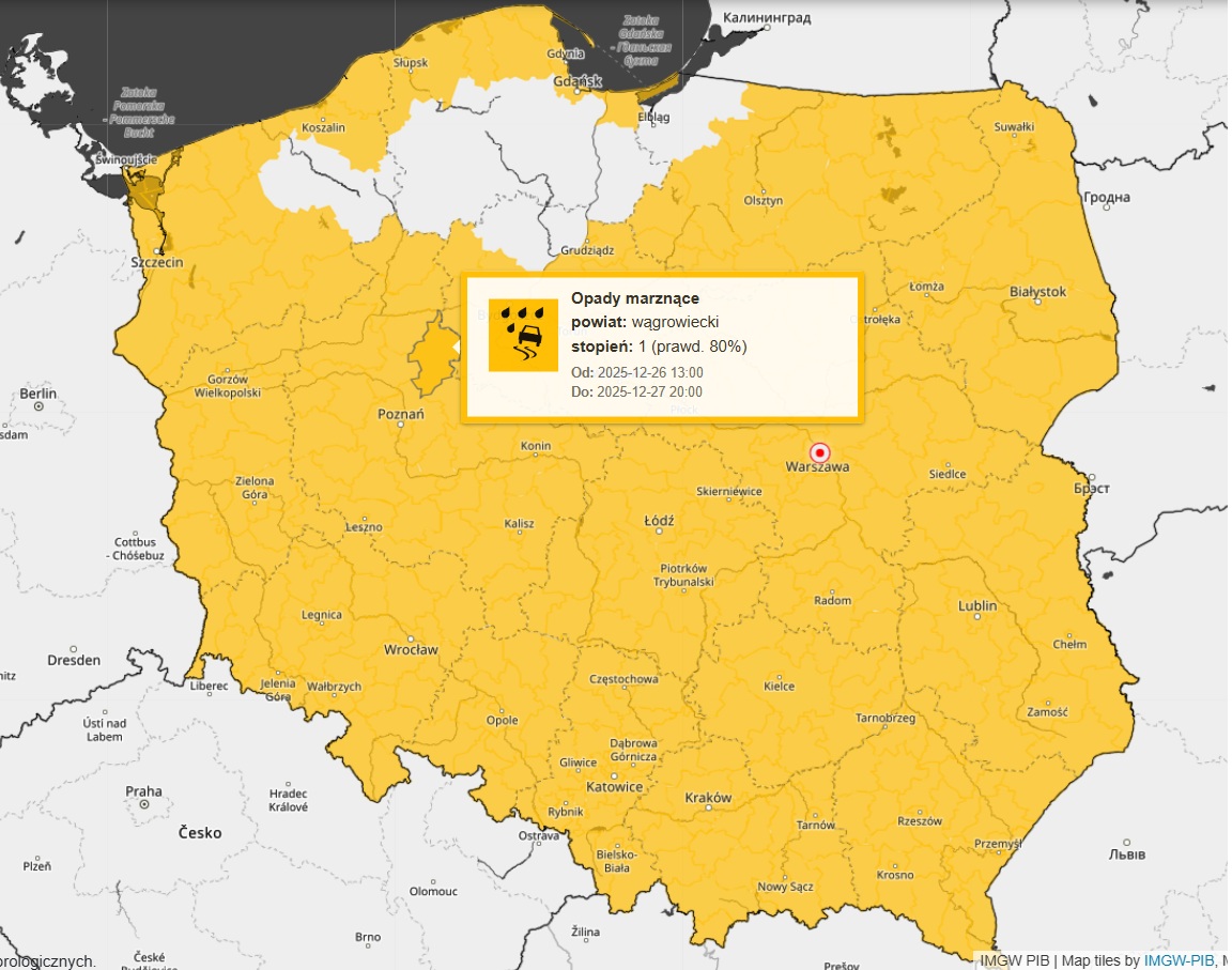 Ostrzeżenie pierwszego stopnia obowiązuje od wczoraj (piątek, 26 grudnia, godzina 13.00) i potrwa przynajmniej do dzisiejszego wieczora (sobota, 27 grudnia), do godziny 20.00. Prawdopodobieństwo wystąpienia zjawiska określono na 80 procent.