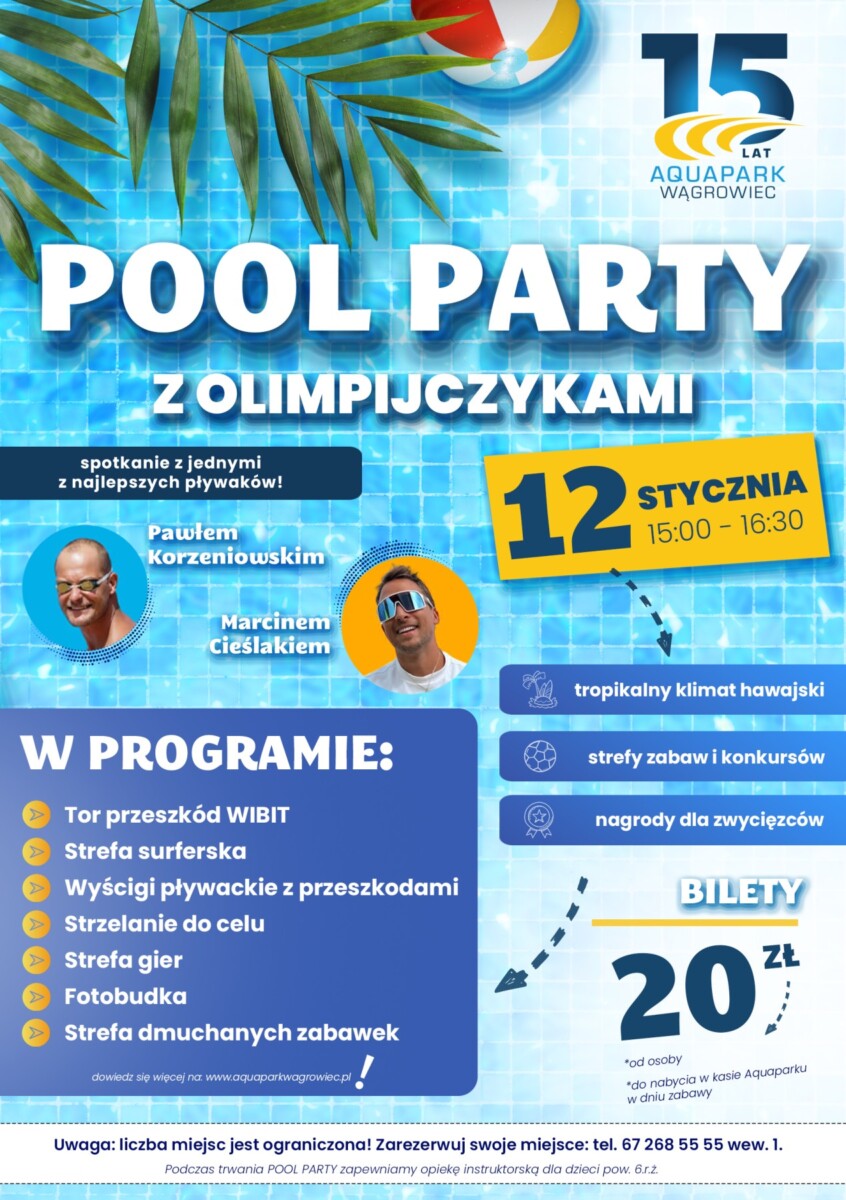 Na program Pool Party złożą się m.in. tor przeszkód WIBIT, strefa surferska, wyścigi pływackie z przeszkodami, gry i zabawy wodne, fotobudka oraz strefa dmuchanych atrakcji. Dla najlepszych uczestników przygotowano nagrody.
