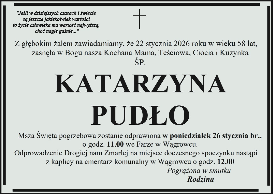 Pogrzeb pani Marii odbędzie się w czwartek 30 marca na cmentarzu komunalnym w Wągrowcu.Pogrzeb pana Marka odbędzie się w piątek 31 marca na cmentarzu komunalnym w Wągrowcu.Pogrzeb pani Małgorzaty odbędzie się we wtorek 28 marca na cmentarzu parafialnym w Popowie Kościelnym.Pogrzeb pani Teresy odbędzie się we wtorek 28 marca na cmentarzu komunalnym w Wągrowcu.Pogrzeb pani Teresy odbędzie się w środę 29 marca na cmentarzu nowofarnym w Wągrowcu.Pogrzeb pani Edwiny odbędzie się w sobotę 25 marca na cmentarzu parafialnym w Żoniu.Pogrzeb pana Stanisława odbędzie się w sobotę 25 marca na cmentarzu nowofarnym w Wągrowcu.Pogrzeb pani Janiny odbędzie się w środę 22 marca na cmentarzu komunalnym w Wągrowcu.Pogrzeb pani Teresy odbędzie się w piątek 24 marca na cmentarzu nowofarnym w Wągrowcu.Pogrzeb pana Henryka odbędzie się we wtorek 21 marca na cmentarzu komunalnym w Wągrowcu.Pogrzeb pani Barbary odbędzie się w piątek 17 marca na cmentarzu nowofarnym w Wągrowcu.Pogrzeb pani Czesławy odbędzie się we wtorek 14 marca na cmentarzu nowofarnym w Wągrowcu.Pogrzeb pana Zygmunta odbędzie się w środę 15 marca na cmentarzu komunalnym w Wągrowcu.Pogrzeb pana Mirosława odbędzie się w piątek 17 marca na cmentarzu komunalnym w Wągrowcu.Pogrzeb pana Joachima odbędzie się we wtorek 14 marca na cmentarzu komunalnym w Wągrowcu.Pogrzeb pana Grzegorza odbędzie się w środę 15 marca na cmentarzu nowofarnym w Wągrowcu.Pogrzeb pana Hieronima odbędzie się we wtorek 14 marca na cmentarzu parafialnym w Skokach.Pogrzeb pani Margarity odbędzie się w poniedziałek 13 marca na cmentarzu nowofarnym w Wągrowcu.Pogrzeb pani Wiesławy odbędzie się w sobotę 11 marca na cmentarzu starofarnym w Wągrowcu.Pogrzeb pani Barbary odbędzie się w czwartek 9 marca na cmentarzu nowofarnym w Wągrowcu.Pogrzeb pani Władysławy odbędzie się w sobotę 11 marca na cmentarzu nowofarnym w Wągrowcu.Pogrzeb pana Piotra odbędzie się w środę 8 marca na cmentarzu komunalnym w Wągrowcu.Pogrzeb pani Aleksandry odbył się we wtorek 7 marca na cmentarzu nowofarnym w Wągrowcu.Pogrzeb pani Danieli odbędzie się w sobotę 11 marca na cmentarzu nowofarnym w Wągrowcu.Pogrzeb pana Pawła odbędzie się w piątek 3 marca na cmentarzu parafialnym w Skokach.Pogrzeb pani Heleny odbędzie się w sobotę 4 marca na cmentarzu starofarnym w Wągrowcu.Pogrzeb pana Kazimierza odbędzie się w sobotę 4 marca na cmentarzu parafialnym w Skokach.Pogrzeb pana Mieczysława odbył się w środę 1 marca na cmentarzu klasztornym w Wągrowcu.Pogrzeb pani Ewy odbędzie się w środę 1 marca na cmentarzu parafialnym w Skokach.Pogrzeb pani Józefy odbędzie się w środę 1 marca na cmentarzu parafialnym w Lechlinie.Pogrzeb pani Władysławy odbędzie się w środę 1 marca na cmentarzu nowofarnym Wągrowcu.Pogrzeb pani Aliny odbędzie się we wtorek 28 lutego na cmentarzu komunalnym Wągrowcu.Pogrzeb pani Krystyny odbędzie się w środę 1 marca na cmentarzu komunalnym Wągrowcu.Pogrzeb pana Bernarda odbędzie się we wtorek 28 lutego na cmentarzu starofarnym Wągrowcu.Pogrzeb pani Zofii odbędzie się we wtorek 28 lutego na cmentarzu nowofarnym w Wągrowcu.Pogrzeb pana Ryszarda odbędzie się w piątek 24 lutego na cmentarzu komunalnym Wągrowcu.Pogrzeb pani Anny odbędzie się w czwartek 23 lutego na cmentarzu nowofarnym Wągrowcu.Pogrzeb pani Barbary odbędzie się w czwartek 23 lutego na cmentarzu nowofarnym Wągrowcu.Pogrzeb pani Ireny odbędzie się w czwartek 23 lutego na cmentarzu nowofarnym Wągrowcu.Pogrzeb pani Czesławy odbędzie się we wtorek 21 lutego na cmentarzu nowofarnym Wągrowcu.Pogrzeb pana Andrzeja odbędzie się w sobotę 18 lutego na cmentarzu nowofarnym Wągrowcu.Pogrzeb pana Czesław odbędzie się w poniedziałek 20 lutego na cmentarzu starofarnym Wągrowcu.Pan Zenon przed laty mieszkał w Wągrowcu. W latach 90-tych wyjechał do USA, ale wciąż ma u nas bliskich i znajomych, z którymi wciąż utrzymywał kontakt. Jego bliskim bardzo zależało, aby poinformować o jego odejściu. Pogrzeb odbędzie się dzisiaj w Nowym Jorku. Pogrzeb pana Tadeusza odbędzie się w piątek 17 lutego na cmentarzu nowofarnym Wągrowcu.Pogrzeb pana Krzysztofa odbył się we wtorek 14 lutego na cmentarzu komunalnym Wągrowcu.Pogrzeb pani Haliny odbędzie się w środę 15 lutego na cmentarzu parafialnym w Czeszewie.Pogrzeb pana Jerzego odbędzie się w środę 15 lutego na cmentarzu komunalnym Wągrowcu.Pogrzeb pana Lechosława odbędzie się we wtorek 114 lutego na cmentarzu parafialnym w Gołańczy.Pogrzeb pani Danuty odbędzie się w sobotę 11 lutego na cmentarzu parafialnym w Lechlinie.Pogrzeb pana Jana odbędzie się w sobotę 11 lutego na cmentarzu komunalnym w Wągrowcu.Pogrzeb pana Kazimierza odbędzie się w środę 8 lutego na cmentarzu nowofarnym w Wągrowcu.Pogrzeb pani Haliny we wtorek 7 lutego na cmentarzu nowofarnym w Wągrowcu.Pogrzeb pana Henryka odbędzie się we środę 8 lutego na cmentarzu komunalnym w Wągrowcu.Pogrzeb pani Urszuli we wtorek 7 lutego na cmentarzu parafialnym w Łeknie.Pogrzeb pani Bożeny odbędzie się we wtorek 7 lutego na cmentarzu komunalnym w Wągrowcu.Pogrzeb pana Kazimierza odbędzie się w poniedziałek 6 lutego na cmentarzu komunalnym w Wągrowcu.Pogrzeb pani Janiny odbędzie się w sobotę 4 lutego na cmentarzu parafialnym w Rogoźnie.Pogrzeb pana Włodzimierza odbędzie się w poniedziałek 6 lutego na cmentarzu komunalnym w Wągrowcu.Pogrzeb pani Marioli odbędzie się w piątek 3 lutego na cmentarzu parafialnym w Potulicach.Pogrzeb pani Danuty odbędzie się w czwartek 2 lutego na cmentarzu klasztornym w Wągrowcu.Pogrzeb pani Gertrudy odbędzie się w czwartek 2 lutego na cmentarzu parafialnym w Żabiczynie.Pogrzeb pana Zdzisława odbędzie się w środę 1 lutego na cmentarzu parafialnym w Gołańczy.Pogrzeb pani Bronisławy odbędzie się w środę 1 lutego na cmentarzu komunalnym w Wągrowcu.Pogrzeb pani Zofii odbył się w poniedzi
