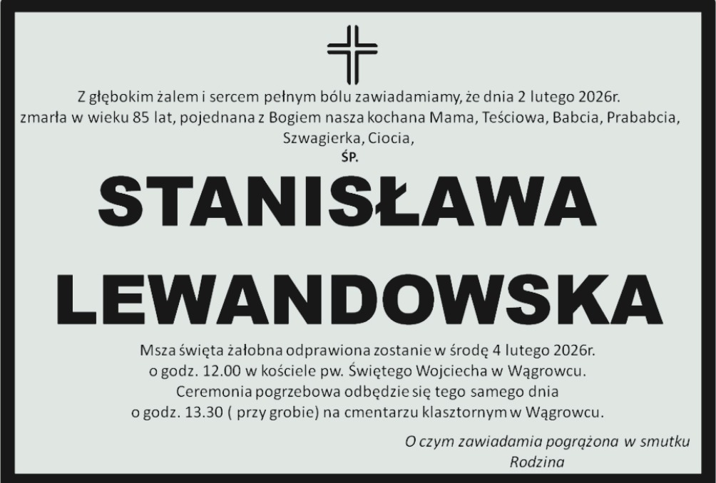 Pogrzeb pani Czesławy odbędzie się we wtorek 21 lutego na cmentarzu nowofarnym Wągrowcu.