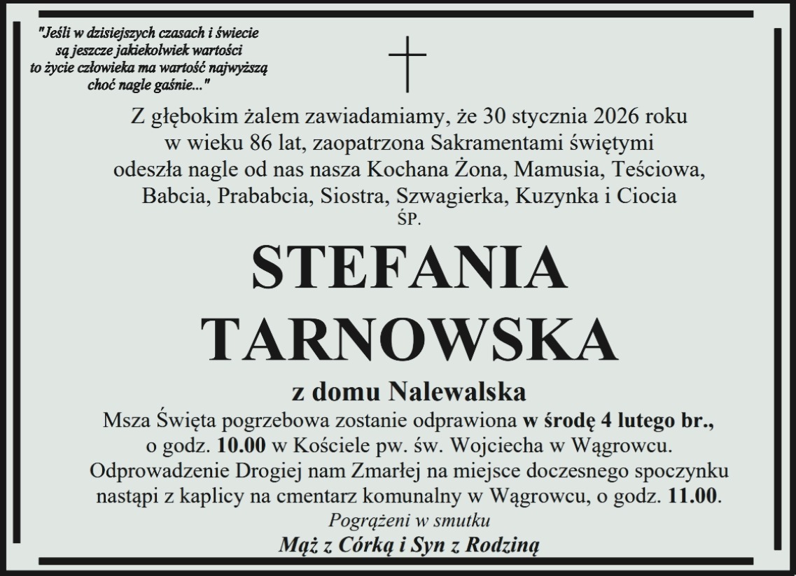 Pogrzeb pani Zofii odbędzie się we wtorek 28 lutego na cmentarzu nowofarnym w Wągrowcu.