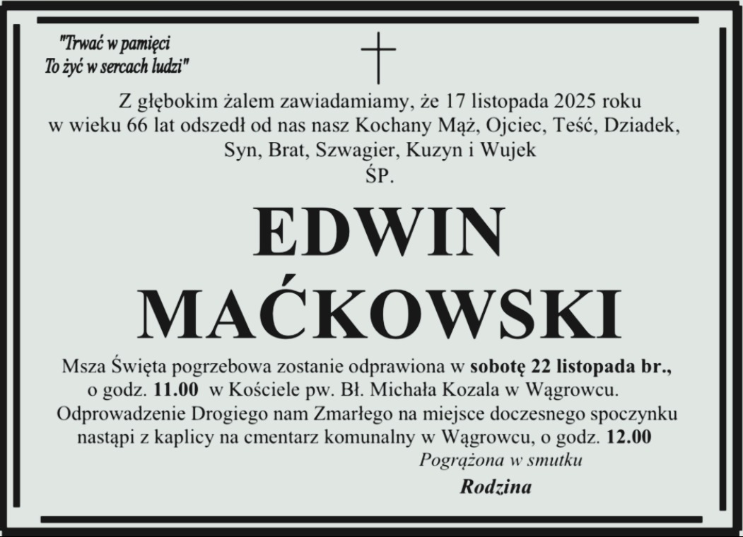 Pogrzeb pana Mieczysława odbędzie się w sobotę 19 listopada na cmentarzu nowofarnym w Wągrowcu.