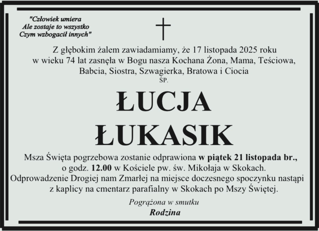 Pogrzeb pani Urszuli odbędzie się we wtorek 17 stycznia na cmentarzu parafialnym w Skokach.