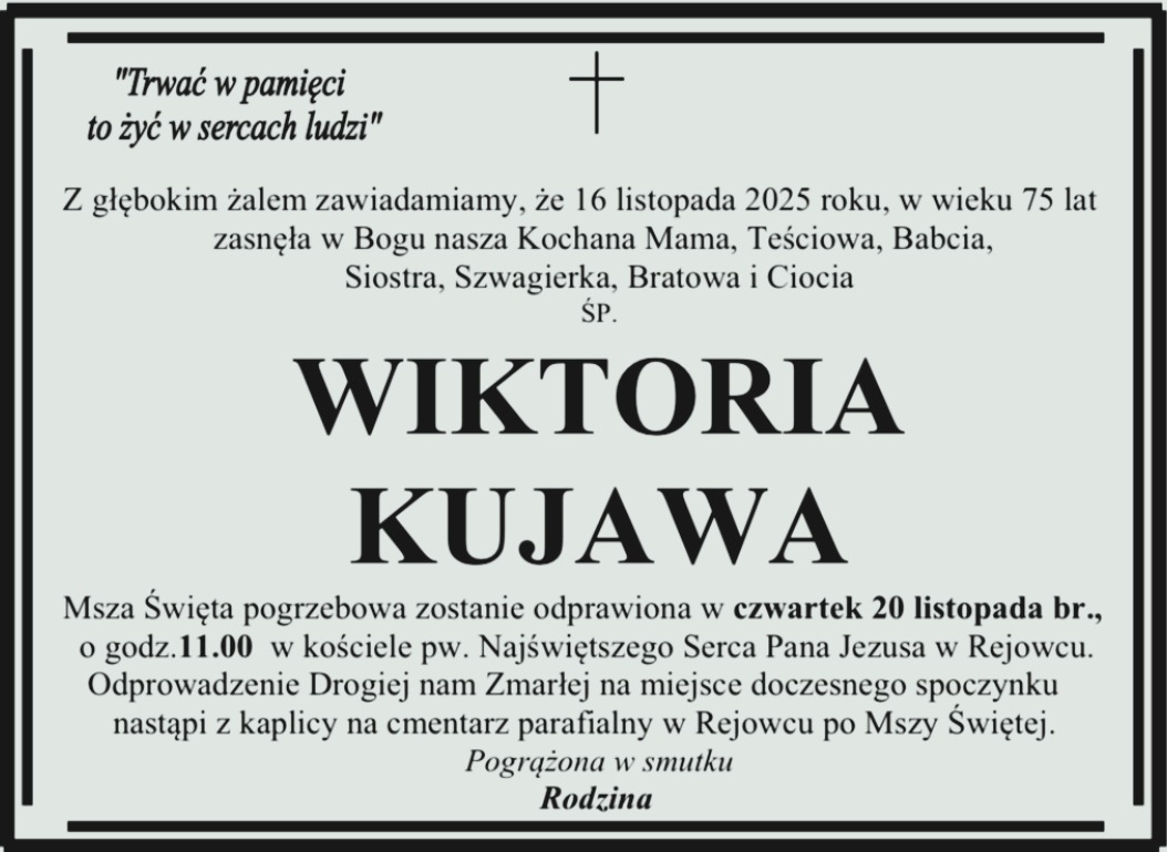 Pogrzeb pani Kazimiery odbędzie się we wtorek 29 listopada na cmentarzu nowofarnym w Wągrowcu.