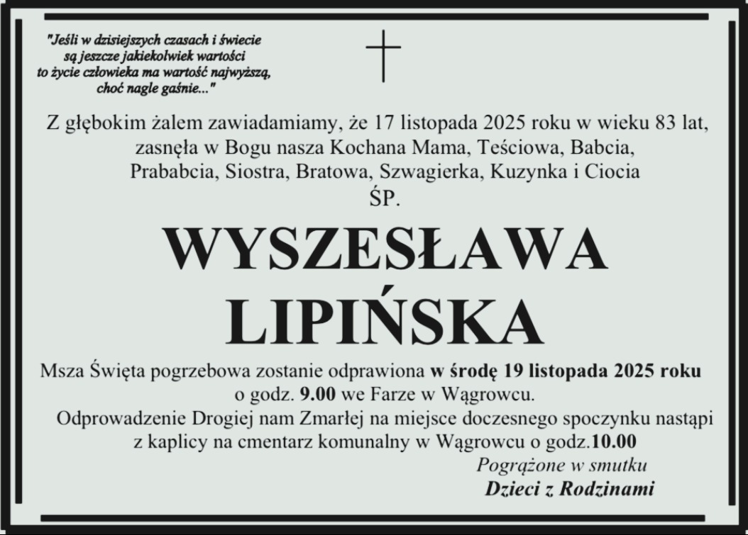 OSTATNIE POŻEGNANIE: Odeszła od nas Wyszesława Lipińska