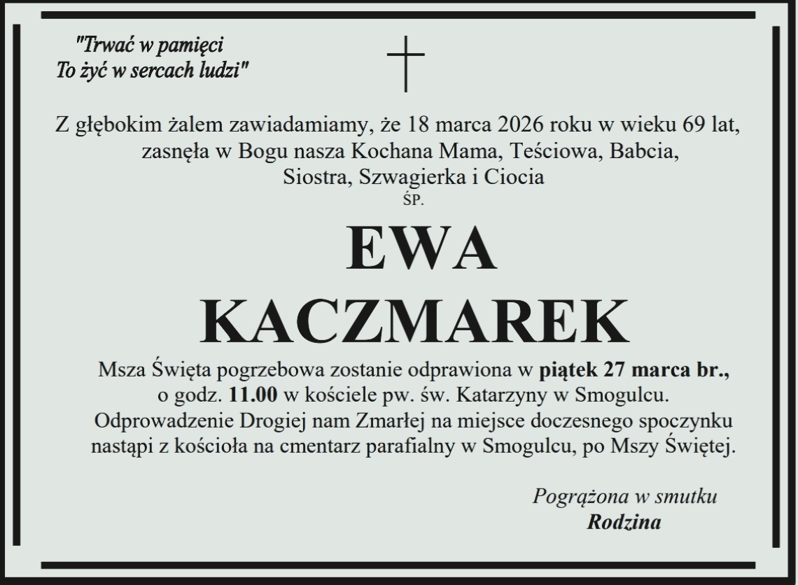 Pogrzeb pani Kazimiery odbędzie się we wtorek 29 listopada na cmentarzu nowofarnym w Wągrowcu.