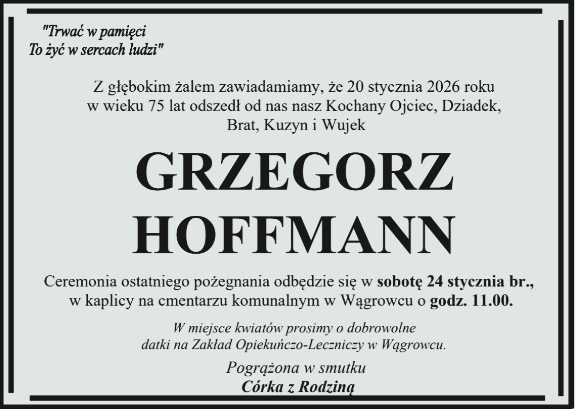 Pogrzeb pani Marii odbędzie się w czwartek 30 marca na cmentarzu komunalnym w Wągrowcu.Pogrzeb pana Marka odbędzie się w piątek 31 marca na cmentarzu komunalnym w Wągrowcu.Pogrzeb pani Małgorzaty odbędzie się we wtorek 28 marca na cmentarzu parafialnym w Popowie Kościelnym.Pogrzeb pani Teresy odbędzie się we wtorek 28 marca na cmentarzu komunalnym w Wągrowcu.Pogrzeb pani Teresy odbędzie się w środę 29 marca na cmentarzu nowofarnym w Wągrowcu.Pogrzeb pani Edwiny odbędzie się w sobotę 25 marca na cmentarzu parafialnym w Żoniu.Pogrzeb pana Stanisława odbędzie się w sobotę 25 marca na cmentarzu nowofarnym w Wągrowcu.Pogrzeb pani Janiny odbędzie się w środę 22 marca na cmentarzu komunalnym w Wągrowcu.Pogrzeb pani Teresy odbędzie się w piątek 24 marca na cmentarzu nowofarnym w Wągrowcu.Pogrzeb pana Henryka odbędzie się we wtorek 21 marca na cmentarzu komunalnym w Wągrowcu.Pogrzeb pani Barbary odbędzie się w piątek 17 marca na cmentarzu nowofarnym w Wągrowcu.Pogrzeb pani Czesławy odbędzie się we wtorek 14 marca na cmentarzu nowofarnym w Wągrowcu.Pogrzeb pana Zygmunta odbędzie się w środę 15 marca na cmentarzu komunalnym w Wągrowcu.Pogrzeb pana Mirosława odbędzie się w piątek 17 marca na cmentarzu komunalnym w Wągrowcu.Pogrzeb pana Joachima odbędzie się we wtorek 14 marca na cmentarzu komunalnym w Wągrowcu.Pogrzeb pana Grzegorza odbędzie się w środę 15 marca na cmentarzu nowofarnym w Wągrowcu.Pogrzeb pana Hieronima odbędzie się we wtorek 14 marca na cmentarzu parafialnym w Skokach.Pogrzeb pani Margarity odbędzie się w poniedziałek 13 marca na cmentarzu nowofarnym w Wągrowcu.Pogrzeb pani Wiesławy odbędzie się w sobotę 11 marca na cmentarzu starofarnym w Wągrowcu.Pogrzeb pani Barbary odbędzie się w czwartek 9 marca na cmentarzu nowofarnym w Wągrowcu.Pogrzeb pani Władysławy odbędzie się w sobotę 11 marca na cmentarzu nowofarnym w Wągrowcu.Pogrzeb pana Piotra odbędzie się w środę 8 marca na cmentarzu komunalnym w Wągrowcu.Pogrzeb pani Aleksandry odbył się we wtorek 7 marca na cmentarzu nowofarnym w Wągrowcu.Pogrzeb pani Danieli odbędzie się w sobotę 11 marca na cmentarzu nowofarnym w Wągrowcu.Pogrzeb pana Pawła odbędzie się w piątek 3 marca na cmentarzu parafialnym w Skokach.Pogrzeb pani Heleny odbędzie się w sobotę 4 marca na cmentarzu starofarnym w Wągrowcu.Pogrzeb pana Kazimierza odbędzie się w sobotę 4 marca na cmentarzu parafialnym w Skokach.Pogrzeb pana Mieczysława odbył się w środę 1 marca na cmentarzu klasztornym w Wągrowcu.Pogrzeb pani Ewy odbędzie się w środę 1 marca na cmentarzu parafialnym w Skokach.Pogrzeb pani Józefy odbędzie się w środę 1 marca na cmentarzu parafialnym w Lechlinie.Pogrzeb pani Władysławy odbędzie się w środę 1 marca na cmentarzu nowofarnym Wągrowcu.Pogrzeb pani Aliny odbędzie się we wtorek 28 lutego na cmentarzu komunalnym Wągrowcu.Pogrzeb pani Krystyny odbędzie się w środę 1 marca na cmentarzu komunalnym Wągrowcu.Pogrzeb pana Bernarda odbędzie się we wtorek 28 lutego na cmentarzu starofarnym Wągrowcu.Pogrzeb pani Zofii odbędzie się we wtorek 28 lutego na cmentarzu nowofarnym w Wągrowcu.Pogrzeb pana Ryszarda odbędzie się w piątek 24 lutego na cmentarzu komunalnym Wągrowcu.Pogrzeb pani Anny odbędzie się w czwartek 23 lutego na cmentarzu nowofarnym Wągrowcu.Pogrzeb pani Barbary odbędzie się w czwartek 23 lutego na cmentarzu nowofarnym Wągrowcu.Pogrzeb pani Ireny odbędzie się w czwartek 23 lutego na cmentarzu nowofarnym Wągrowcu.Pogrzeb pani Czesławy odbędzie się we wtorek 21 lutego na cmentarzu nowofarnym Wągrowcu.Pogrzeb pana Andrzeja odbędzie się w sobotę 18 lutego na cmentarzu nowofarnym Wągrowcu.Pogrzeb pana Czesław odbędzie się w poniedziałek 20 lutego na cmentarzu starofarnym Wągrowcu.Pan Zenon przed laty mieszkał w Wągrowcu. W latach 90-tych wyjechał do USA, ale wciąż ma u nas bliskich i znajomych, z którymi wciąż utrzymywał kontakt. Jego bliskim bardzo zależało, aby poinformować o jego odejściu. Pogrzeb odbędzie się dzisiaj w Nowym Jorku. Pogrzeb pana Tadeusza odbędzie się w piątek 17 lutego na cmentarzu nowofarnym Wągrowcu.Pogrzeb pana Krzysztofa odbył się we wtorek 14 lutego na cmentarzu komunalnym Wągrowcu.Pogrzeb pani Haliny odbędzie się w środę 15 lutego na cmentarzu parafialnym w Czeszewie.Pogrzeb pana Jerzego odbędzie się w środę 15 lutego na cmentarzu komunalnym Wągrowcu.Pogrzeb pana Lechosława odbędzie się we wtorek 114 lutego na cmentarzu parafialnym w Gołańczy.Pogrzeb pani Danuty odbędzie się w sobotę 11 lutego na cmentarzu parafialnym w Lechlinie.Pogrzeb pana Jana odbędzie się w sobotę 11 lutego na cmentarzu komunalnym w Wągrowcu.Pogrzeb pana Kazimierza odbędzie się w środę 8 lutego na cmentarzu nowofarnym w Wągrowcu.Pogrzeb pani Haliny we wtorek 7 lutego na cmentarzu nowofarnym w Wągrowcu.Pogrzeb pana Henryka odbędzie się we środę 8 lutego na cmentarzu komunalnym w Wągrowcu.Pogrzeb pani Urszuli we wtorek 7 lutego na cmentarzu parafialnym w Łeknie.Pogrzeb pani Bożeny odbędzie się we wtorek 7 lutego na cmentarzu komunalnym w Wągrowcu.Pogrzeb pana Kazimierza odbędzie się w poniedziałek 6 lutego na cmentarzu komunalnym w Wągrowcu.Pogrzeb pani Janiny odbędzie się w sobotę 4 lutego na cmentarzu parafialnym w Rogoźnie.Pogrzeb pana Włodzimierza odbędzie się w poniedziałek 6 lutego na cmentarzu komunalnym w Wągrowcu.Pogrzeb pani Marioli odbędzie się w piątek 3 lutego na cmentarzu parafialnym w Potulicach.Pogrzeb pani Danuty odbędzie się w czwartek 2 lutego na cmentarzu klasztornym w Wągrowcu.Pogrzeb pani Gertrudy odbędzie się w czwartek 2 lutego na cmentarzu parafialnym w Żabiczynie.Pogrzeb pana Zdzisława odbędzie się w środę 1 lutego na cmentarzu parafialnym w Gołańczy.Pogrzeb pani Bronisławy odbędzie się w środę 1 lutego na cmentarzu komunalnym w Wągrowcu.Pogrzeb pani Zofii odbył się w poniedzi