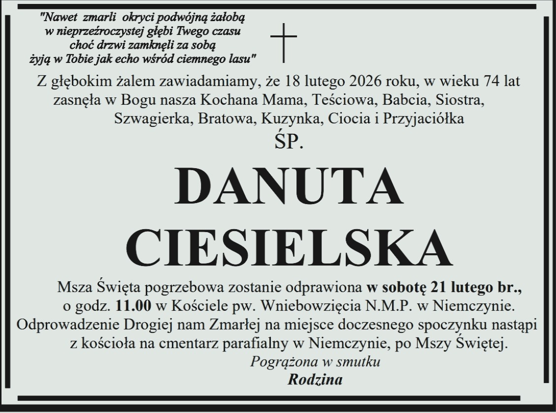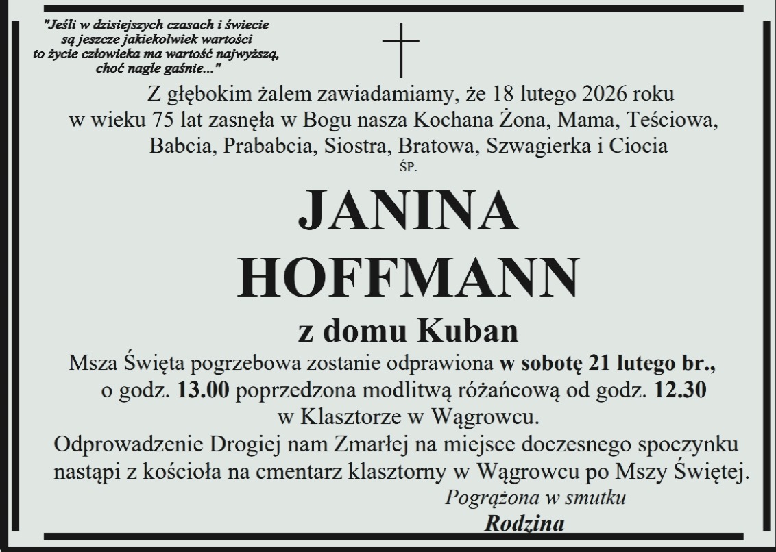 Pogrzeb pani Marii odbędzie się w czwartek 30 marca na cmentarzu komunalnym w Wągrowcu.Pogrzeb pana Marka odbędzie się w piątek 31 marca na cmentarzu komunalnym w Wągrowcu.Pogrzeb pani Małgorzaty odbędzie się we wtorek 28 marca na cmentarzu parafialnym w Popowie Kościelnym.Pogrzeb pani Teresy odbędzie się we wtorek 28 marca na cmentarzu komunalnym w Wągrowcu.Pogrzeb pani Teresy odbędzie się w środę 29 marca na cmentarzu nowofarnym w Wągrowcu.Pogrzeb pani Edwiny odbędzie się w sobotę 25 marca na cmentarzu parafialnym w Żoniu.Pogrzeb pana Stanisława odbędzie się w sobotę 25 marca na cmentarzu nowofarnym w Wągrowcu.Pogrzeb pani Janiny odbędzie się w środę 22 marca na cmentarzu komunalnym w Wągrowcu.Pogrzeb pani Teresy odbędzie się w piątek 24 marca na cmentarzu nowofarnym w Wągrowcu.Pogrzeb pana Henryka odbędzie się we wtorek 21 marca na cmentarzu komunalnym w Wągrowcu.Pogrzeb pani Barbary odbędzie się w piątek 17 marca na cmentarzu nowofarnym w Wągrowcu.Pogrzeb pani Czesławy odbędzie się we wtorek 14 marca na cmentarzu nowofarnym w Wągrowcu.Pogrzeb pana Zygmunta odbędzie się w środę 15 marca na cmentarzu komunalnym w Wągrowcu.Pogrzeb pana Mirosława odbędzie się w piątek 17 marca na cmentarzu komunalnym w Wągrowcu.Pogrzeb pana Joachima odbędzie się we wtorek 14 marca na cmentarzu komunalnym w Wągrowcu.Pogrzeb pana Grzegorza odbędzie się w środę 15 marca na cmentarzu nowofarnym w Wągrowcu.Pogrzeb pana Hieronima odbędzie się we wtorek 14 marca na cmentarzu parafialnym w Skokach.Pogrzeb pani Margarity odbędzie się w poniedziałek 13 marca na cmentarzu nowofarnym w Wągrowcu.Pogrzeb pani Wiesławy odbędzie się w sobotę 11 marca na cmentarzu starofarnym w Wągrowcu.Pogrzeb pani Barbary odbędzie się w czwartek 9 marca na cmentarzu nowofarnym w Wągrowcu.Pogrzeb pani Władysławy odbędzie się w sobotę 11 marca na cmentarzu nowofarnym w Wągrowcu.Pogrzeb pana Piotra odbędzie się w środę 8 marca na cmentarzu komunalnym w Wągrowcu.Pogrzeb pani Aleksandry odbył się we wtorek 7 marca na cmentarzu nowofarnym w Wągrowcu.Pogrzeb pani Danieli odbędzie się w sobotę 11 marca na cmentarzu nowofarnym w Wągrowcu.Pogrzeb pana Pawła odbędzie się w piątek 3 marca na cmentarzu parafialnym w Skokach.Pogrzeb pani Heleny odbędzie się w sobotę 4 marca na cmentarzu starofarnym w Wągrowcu.Pogrzeb pana Kazimierza odbędzie się w sobotę 4 marca na cmentarzu parafialnym w Skokach.Pogrzeb pana Mieczysława odbył się w środę 1 marca na cmentarzu klasztornym w Wągrowcu.Pogrzeb pani Ewy odbędzie się w środę 1 marca na cmentarzu parafialnym w Skokach.Pogrzeb pani Józefy odbędzie się w środę 1 marca na cmentarzu parafialnym w Lechlinie.Pogrzeb pani Władysławy odbędzie się w środę 1 marca na cmentarzu nowofarnym Wągrowcu.Pogrzeb pani Aliny odbędzie się we wtorek 28 lutego na cmentarzu komunalnym Wągrowcu.Pogrzeb pani Krystyny odbędzie się w środę 1 marca na cmentarzu komunalnym Wągrowcu.Pogrzeb pana Bernarda odbędzie się we wtorek 28 lutego na cmentarzu starofarnym Wągrowcu.Pogrzeb pani Zofii odbędzie się we wtorek 28 lutego na cmentarzu nowofarnym w Wągrowcu.Pogrzeb pana Ryszarda odbędzie się w piątek 24 lutego na cmentarzu komunalnym Wągrowcu.Pogrzeb pani Anny odbędzie się w czwartek 23 lutego na cmentarzu nowofarnym Wągrowcu.Pogrzeb pani Barbary odbędzie się w czwartek 23 lutego na cmentarzu nowofarnym Wągrowcu.Pogrzeb pani Ireny odbędzie się w czwartek 23 lutego na cmentarzu nowofarnym Wągrowcu.Pogrzeb pani Czesławy odbędzie się we wtorek 21 lutego na cmentarzu nowofarnym Wągrowcu.Pogrzeb pana Andrzeja odbędzie się w sobotę 18 lutego na cmentarzu nowofarnym Wągrowcu.Pogrzeb pana Czesław odbędzie się w poniedziałek 20 lutego na cmentarzu starofarnym Wągrowcu.Pan Zenon przed laty mieszkał w Wągrowcu. W latach 90-tych wyjechał do USA, ale wciąż ma u nas bliskich i znajomych, z którymi wciąż utrzymywał kontakt. Jego bliskim bardzo zależało, aby poinformować o jego odejściu. Pogrzeb odbędzie się dzisiaj w Nowym Jorku. Pogrzeb pana Tadeusza odbędzie się w piątek 17 lutego na cmentarzu nowofarnym Wągrowcu.Pogrzeb pana Krzysztofa odbył się we wtorek 14 lutego na cmentarzu komunalnym Wągrowcu.Pogrzeb pani Haliny odbędzie się w środę 15 lutego na cmentarzu parafialnym w Czeszewie.Pogrzeb pana Jerzego odbędzie się w środę 15 lutego na cmentarzu komunalnym Wągrowcu.Pogrzeb pana Lechosława odbędzie się we wtorek 114 lutego na cmentarzu parafialnym w Gołańczy.Pogrzeb pani Danuty odbędzie się w sobotę 11 lutego na cmentarzu parafialnym w Lechlinie.Pogrzeb pana Jana odbędzie się w sobotę 11 lutego na cmentarzu komunalnym w Wągrowcu.Pogrzeb pana Kazimierza odbędzie się w środę 8 lutego na cmentarzu nowofarnym w Wągrowcu.Pogrzeb pani Haliny we wtorek 7 lutego na cmentarzu nowofarnym w Wągrowcu.Pogrzeb pana Henryka odbędzie się we środę 8 lutego na cmentarzu komunalnym w Wągrowcu.Pogrzeb pani Urszuli we wtorek 7 lutego na cmentarzu parafialnym w Łeknie.Pogrzeb pani Bożeny odbędzie się we wtorek 7 lutego na cmentarzu komunalnym w Wągrowcu.Pogrzeb pana Kazimierza odbędzie się w poniedziałek 6 lutego na cmentarzu komunalnym w Wągrowcu.Pogrzeb pani Janiny odbędzie się w sobotę 4 lutego na cmentarzu parafialnym w Rogoźnie.Pogrzeb pana Włodzimierza odbędzie się w poniedziałek 6 lutego na cmentarzu komunalnym w Wągrowcu.Pogrzeb pani Marioli odbędzie się w piątek 3 lutego na cmentarzu parafialnym w Potulicach.Pogrzeb pani Danuty odbędzie się w czwartek 2 lutego na cmentarzu klasztornym w Wągrowcu.Pogrzeb pani Gertrudy odbędzie się w czwartek 2 lutego na cmentarzu parafialnym w Żabiczynie.Pogrzeb pana Zdzisława odbędzie się w środę 1 lutego na cmentarzu parafialnym w Gołańczy.Pogrzeb pani Bronisławy odbędzie się w środę 1 lutego na cmentarzu komunalnym w Wągrowcu.Pogrzeb pani Zofii odbył się w poniedzi
