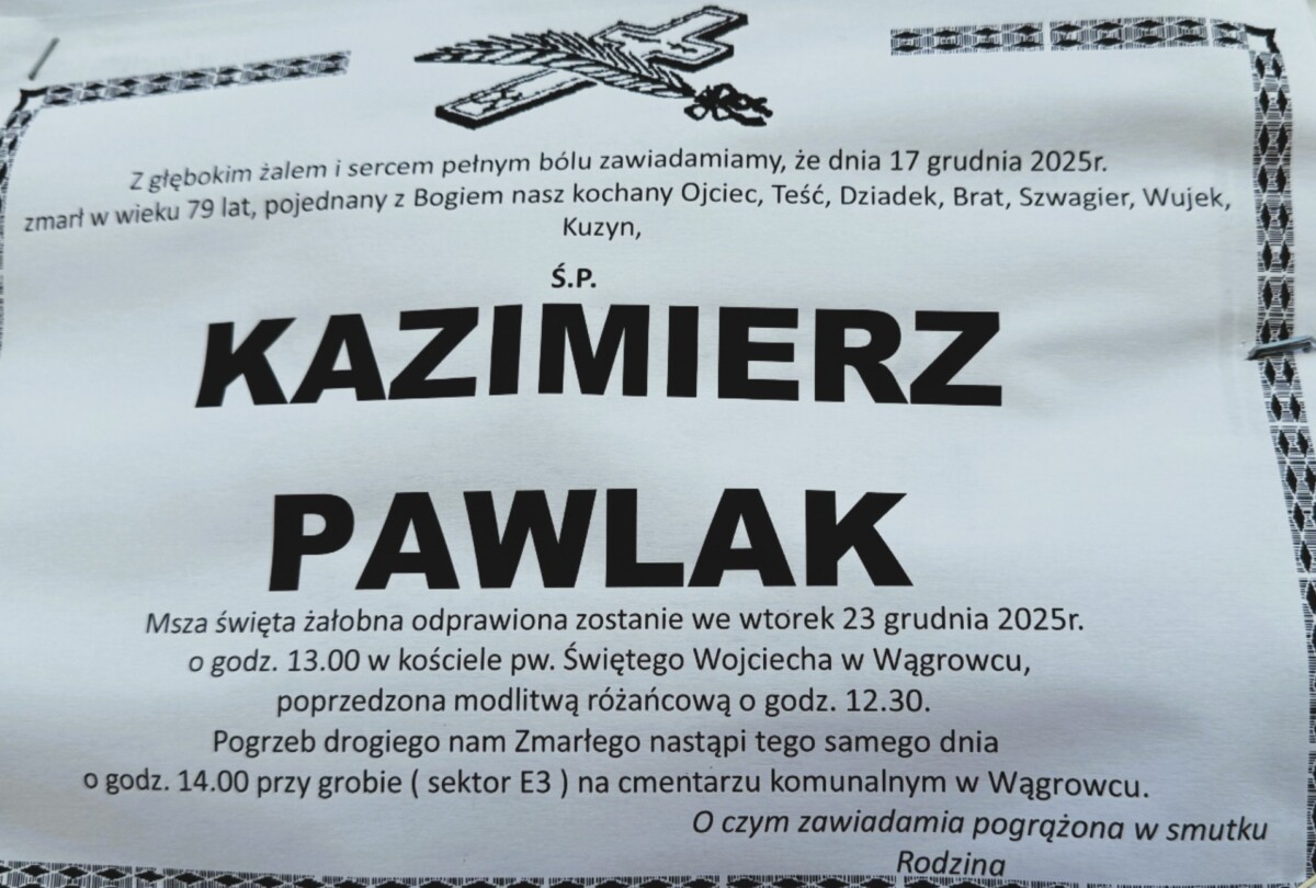 Pogrzeb pana Władysława odbędzie się w środę 14 grudnia na cmentarzu komunalnym w Wągrowcu.