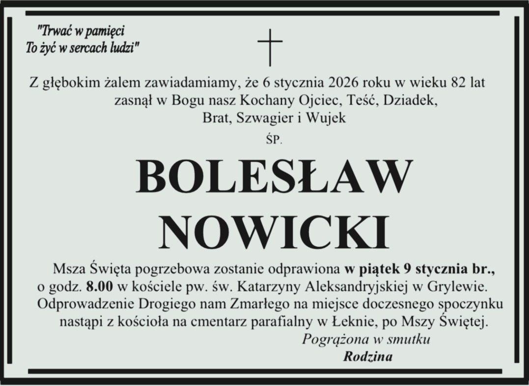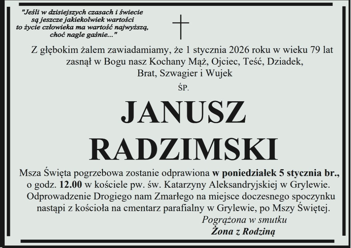 Pogrzeb pana Zdzisława odbędzie się we wtorek 10 stycznia na cmentarzu w Grylewie.