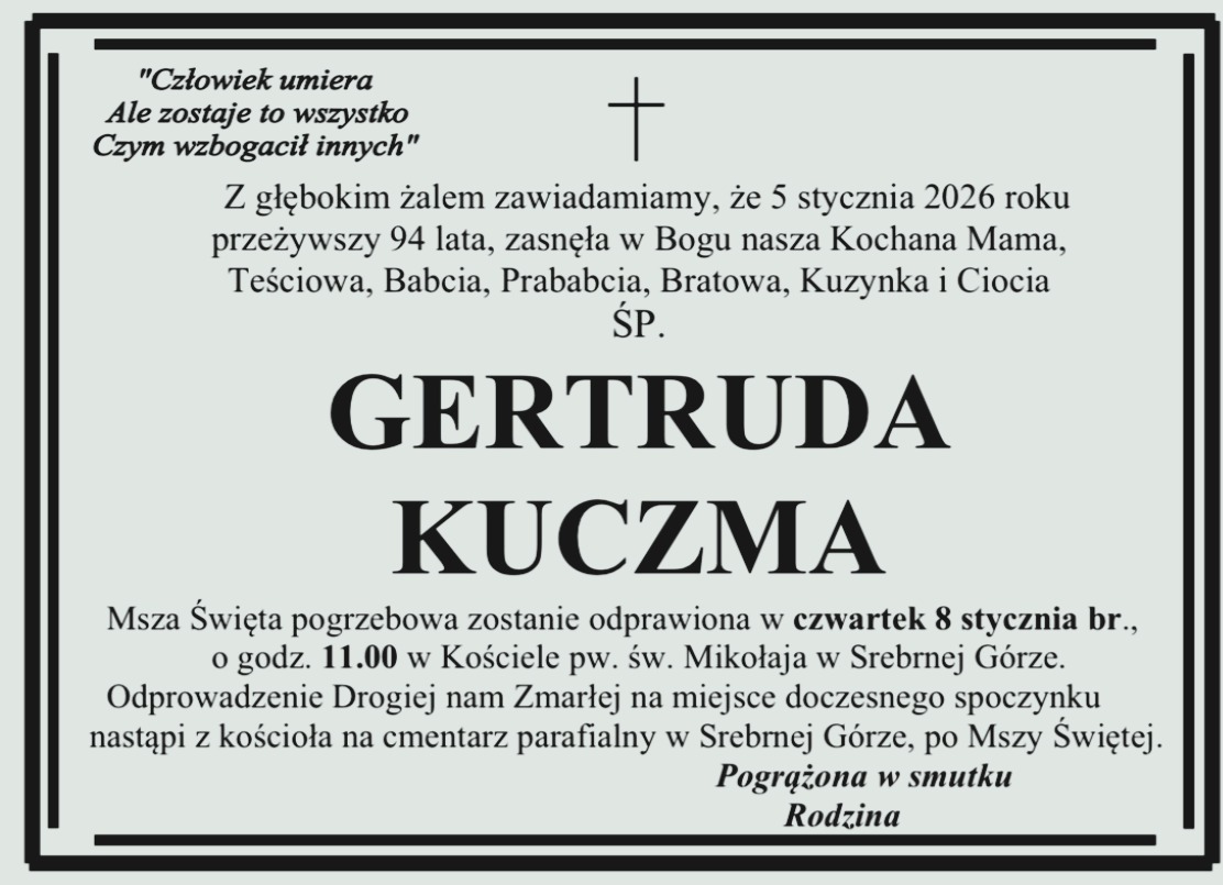 Pogrzeb pani Gertrudy odbędzie się w czwartek 2 lutego na cmentarzu parafialnym w Żabiczynie.