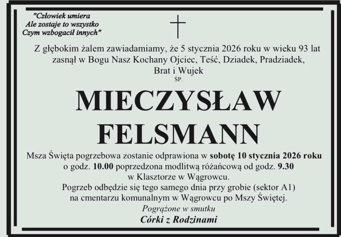 Pogrzeb pana Mieczysława odbędzie się środę 21 grudnia na cmentarzu starofarnym w Wągrowcu.