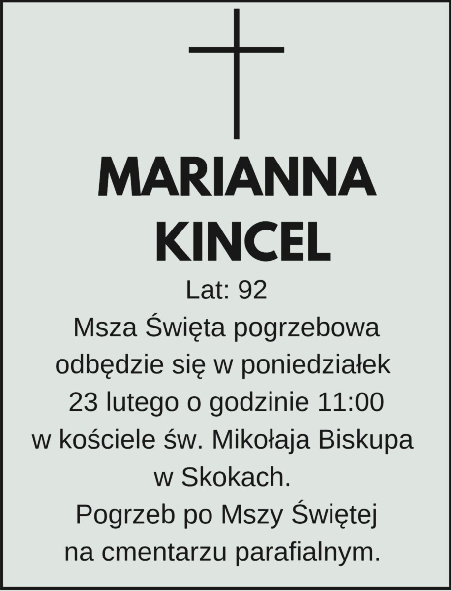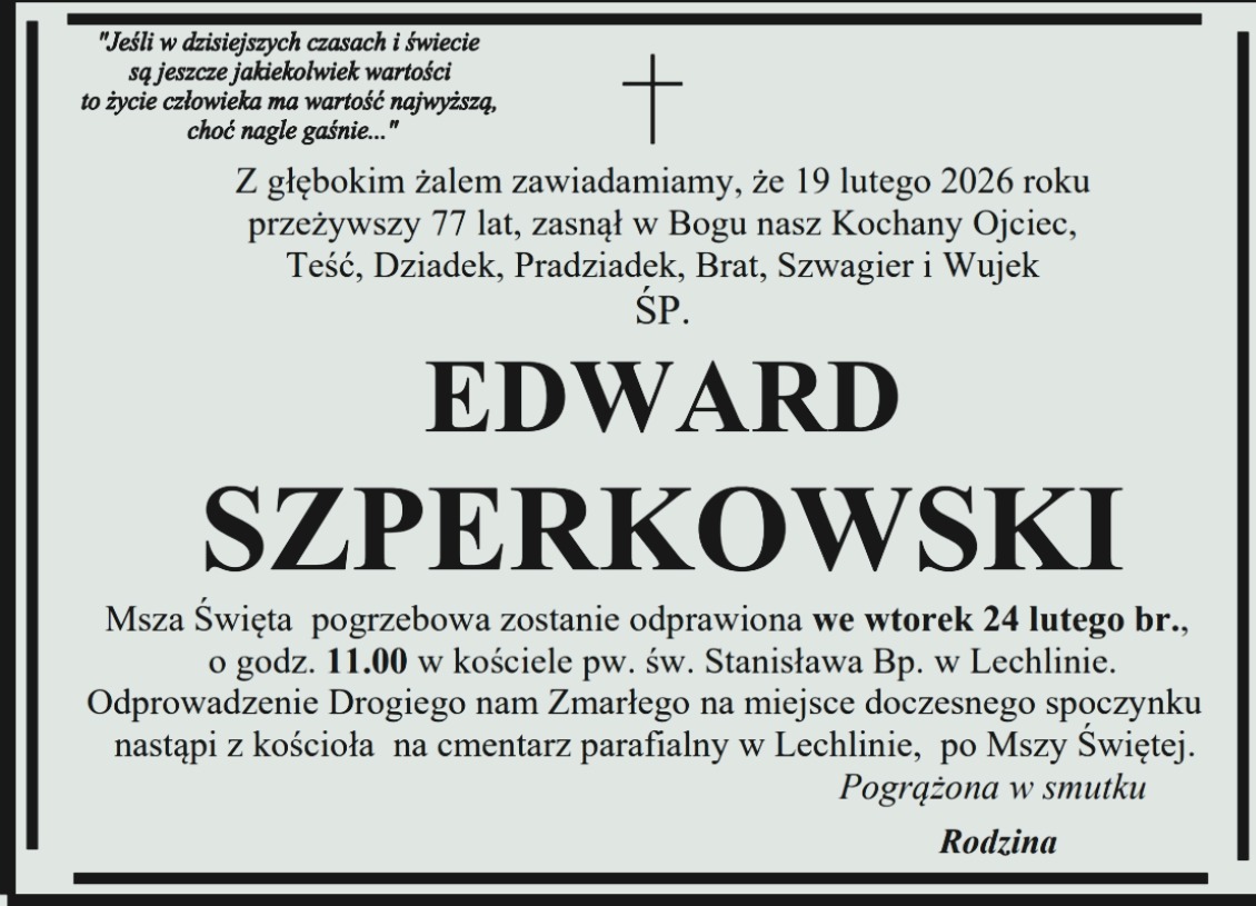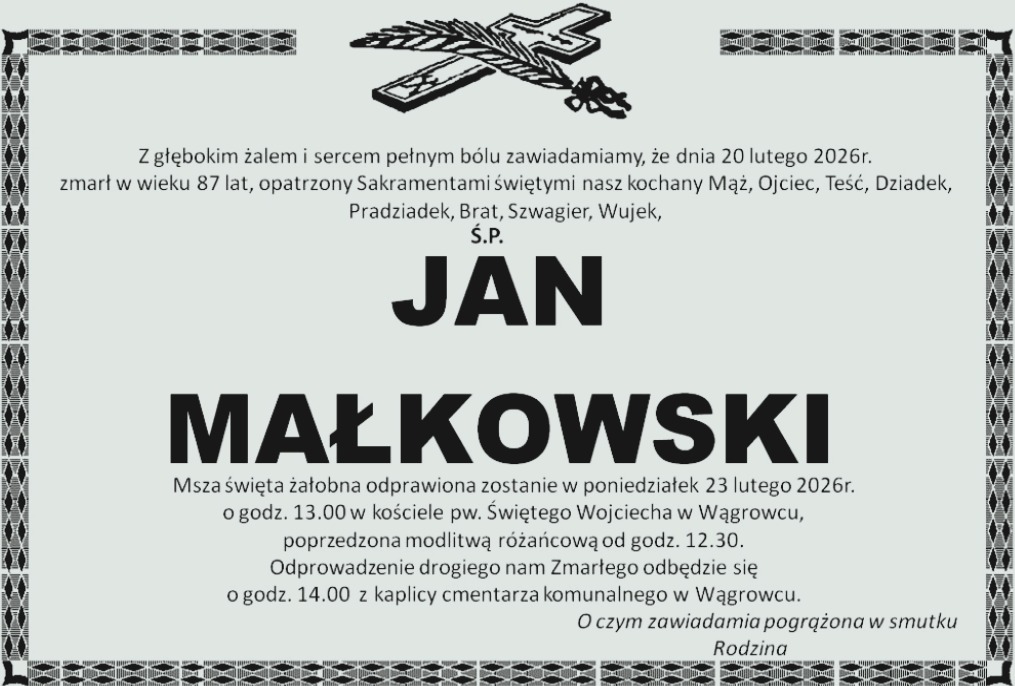 Pogrzeb pani Marii odbędzie się w czwartek 30 marca na cmentarzu komunalnym w Wągrowcu.Pogrzeb pana Marka odbędzie się w piątek 31 marca na cmentarzu komunalnym w Wągrowcu.Pogrzeb pani Małgorzaty odbędzie się we wtorek 28 marca na cmentarzu parafialnym w Popowie Kościelnym.Pogrzeb pani Teresy odbędzie się we wtorek 28 marca na cmentarzu komunalnym w Wągrowcu.Pogrzeb pani Teresy odbędzie się w środę 29 marca na cmentarzu nowofarnym w Wągrowcu.Pogrzeb pani Edwiny odbędzie się w sobotę 25 marca na cmentarzu parafialnym w Żoniu.Pogrzeb pana Stanisława odbędzie się w sobotę 25 marca na cmentarzu nowofarnym w Wągrowcu.Pogrzeb pani Janiny odbędzie się w środę 22 marca na cmentarzu komunalnym w Wągrowcu.Pogrzeb pani Teresy odbędzie się w piątek 24 marca na cmentarzu nowofarnym w Wągrowcu.Pogrzeb pana Henryka odbędzie się we wtorek 21 marca na cmentarzu komunalnym w Wągrowcu.Pogrzeb pani Barbary odbędzie się w piątek 17 marca na cmentarzu nowofarnym w Wągrowcu.Pogrzeb pani Czesławy odbędzie się we wtorek 14 marca na cmentarzu nowofarnym w Wągrowcu.Pogrzeb pana Zygmunta odbędzie się w środę 15 marca na cmentarzu komunalnym w Wągrowcu.Pogrzeb pana Mirosława odbędzie się w piątek 17 marca na cmentarzu komunalnym w Wągrowcu.Pogrzeb pana Joachima odbędzie się we wtorek 14 marca na cmentarzu komunalnym w Wągrowcu.Pogrzeb pana Grzegorza odbędzie się w środę 15 marca na cmentarzu nowofarnym w Wągrowcu.Pogrzeb pana Hieronima odbędzie się we wtorek 14 marca na cmentarzu parafialnym w Skokach.Pogrzeb pani Margarity odbędzie się w poniedziałek 13 marca na cmentarzu nowofarnym w Wągrowcu.Pogrzeb pani Wiesławy odbędzie się w sobotę 11 marca na cmentarzu starofarnym w Wągrowcu.Pogrzeb pani Barbary odbędzie się w czwartek 9 marca na cmentarzu nowofarnym w Wągrowcu.Pogrzeb pani Władysławy odbędzie się w sobotę 11 marca na cmentarzu nowofarnym w Wągrowcu.Pogrzeb pana Piotra odbędzie się w środę 8 marca na cmentarzu komunalnym w Wągrowcu.Pogrzeb pani Aleksandry odbył się we wtorek 7 marca na cmentarzu nowofarnym w Wągrowcu.Pogrzeb pani Danieli odbędzie się w sobotę 11 marca na cmentarzu nowofarnym w Wągrowcu.Pogrzeb pana Pawła odbędzie się w piątek 3 marca na cmentarzu parafialnym w Skokach.Pogrzeb pani Heleny odbędzie się w sobotę 4 marca na cmentarzu starofarnym w Wągrowcu.Pogrzeb pana Kazimierza odbędzie się w sobotę 4 marca na cmentarzu parafialnym w Skokach.Pogrzeb pana Mieczysława odbył się w środę 1 marca na cmentarzu klasztornym w Wągrowcu.Pogrzeb pani Ewy odbędzie się w środę 1 marca na cmentarzu parafialnym w Skokach.Pogrzeb pani Józefy odbędzie się w środę 1 marca na cmentarzu parafialnym w Lechlinie.Pogrzeb pani Władysławy odbędzie się w środę 1 marca na cmentarzu nowofarnym Wągrowcu.Pogrzeb pani Aliny odbędzie się we wtorek 28 lutego na cmentarzu komunalnym Wągrowcu.Pogrzeb pani Krystyny odbędzie się w środę 1 marca na cmentarzu komunalnym Wągrowcu.Pogrzeb pana Bernarda odbędzie się we wtorek 28 lutego na cmentarzu starofarnym Wągrowcu.Pogrzeb pani Zofii odbędzie się we wtorek 28 lutego na cmentarzu nowofarnym w Wągrowcu.Pogrzeb pana Ryszarda odbędzie się w piątek 24 lutego na cmentarzu komunalnym Wągrowcu.Pogrzeb pani Anny odbędzie się w czwartek 23 lutego na cmentarzu nowofarnym Wągrowcu.Pogrzeb pani Barbary odbędzie się w czwartek 23 lutego na cmentarzu nowofarnym Wągrowcu.Pogrzeb pani Ireny odbędzie się w czwartek 23 lutego na cmentarzu nowofarnym Wągrowcu.Pogrzeb pani Czesławy odbędzie się we wtorek 21 lutego na cmentarzu nowofarnym Wągrowcu.Pogrzeb pana Andrzeja odbędzie się w sobotę 18 lutego na cmentarzu nowofarnym Wągrowcu.Pogrzeb pana Czesław odbędzie się w poniedziałek 20 lutego na cmentarzu starofarnym Wągrowcu.Pan Zenon przed laty mieszkał w Wągrowcu. W latach 90-tych wyjechał do USA, ale wciąż ma u nas bliskich i znajomych, z którymi wciąż utrzymywał kontakt. Jego bliskim bardzo zależało, aby poinformować o jego odejściu. Pogrzeb odbędzie się dzisiaj w Nowym Jorku. Pogrzeb pana Tadeusza odbędzie się w piątek 17 lutego na cmentarzu nowofarnym Wągrowcu.Pogrzeb pana Krzysztofa odbył się we wtorek 14 lutego na cmentarzu komunalnym Wągrowcu.Pogrzeb pani Haliny odbędzie się w środę 15 lutego na cmentarzu parafialnym w Czeszewie.Pogrzeb pana Jerzego odbędzie się w środę 15 lutego na cmentarzu komunalnym Wągrowcu.Pogrzeb pana Lechosława odbędzie się we wtorek 114 lutego na cmentarzu parafialnym w Gołańczy.Pogrzeb pani Danuty odbędzie się w sobotę 11 lutego na cmentarzu parafialnym w Lechlinie.Pogrzeb pana Jana odbędzie się w sobotę 11 lutego na cmentarzu komunalnym w Wągrowcu.Pogrzeb pana Kazimierza odbędzie się w środę 8 lutego na cmentarzu nowofarnym w Wągrowcu.Pogrzeb pani Haliny we wtorek 7 lutego na cmentarzu nowofarnym w Wągrowcu.Pogrzeb pana Henryka odbędzie się we środę 8 lutego na cmentarzu komunalnym w Wągrowcu.Pogrzeb pani Urszuli we wtorek 7 lutego na cmentarzu parafialnym w Łeknie.Pogrzeb pani Bożeny odbędzie się we wtorek 7 lutego na cmentarzu komunalnym w Wągrowcu.Pogrzeb pana Kazimierza odbędzie się w poniedziałek 6 lutego na cmentarzu komunalnym w Wągrowcu.Pogrzeb pani Janiny odbędzie się w sobotę 4 lutego na cmentarzu parafialnym w Rogoźnie.Pogrzeb pana Włodzimierza odbędzie się w poniedziałek 6 lutego na cmentarzu komunalnym w Wągrowcu.Pogrzeb pani Marioli odbędzie się w piątek 3 lutego na cmentarzu parafialnym w Potulicach.Pogrzeb pani Danuty odbędzie się w czwartek 2 lutego na cmentarzu klasztornym w Wągrowcu.Pogrzeb pani Gertrudy odbędzie się w czwartek 2 lutego na cmentarzu parafialnym w Żabiczynie.Pogrzeb pana Zdzisława odbędzie się w środę 1 lutego na cmentarzu parafialnym w Gołańczy.Pogrzeb pani Bronisławy odbędzie się w środę 1 lutego na cmentarzu komunalnym w Wągrowcu.Pogrzeb pani Zofii odbył się w poniedzi