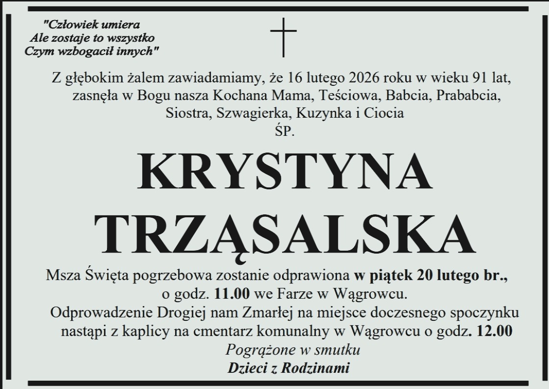 Pogrzeb pani Krystyny odbędzie się w środę 1 marca na cmentarzu komunalnym Wągrowcu.