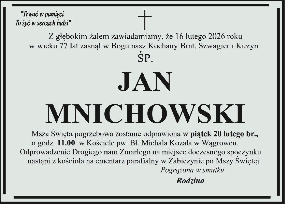 Pogrzeb pana Jana odbędzie się we wtorek 13 grudnia na cmentarzu nowofarnym w Wągrowcu.