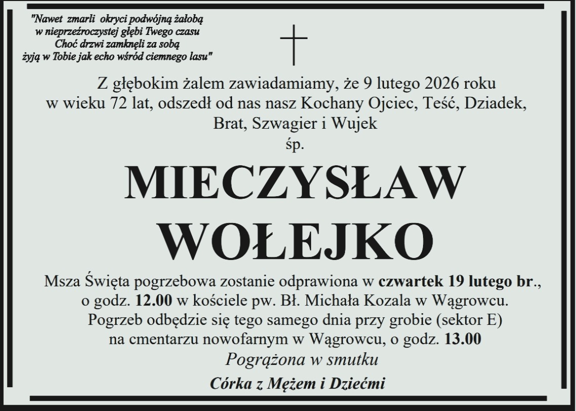 Pogrzeb pana Czesław odbędzie się w poniedziałek 20 lutego na cmentarzu starofarnym Wągrowcu.