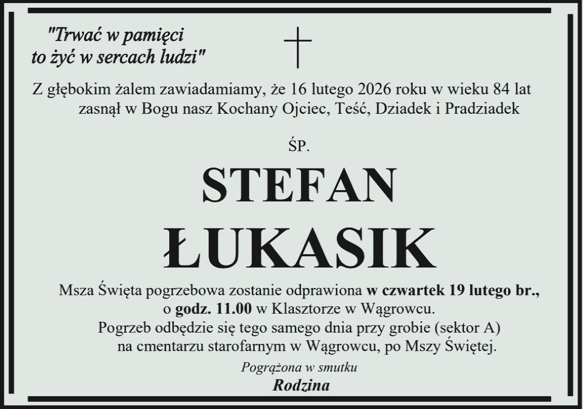 Pogrzeb pana Stanisława odbędzie się w sobotę 25 marca na cmentarzu nowofarnym w Wągrowcu.