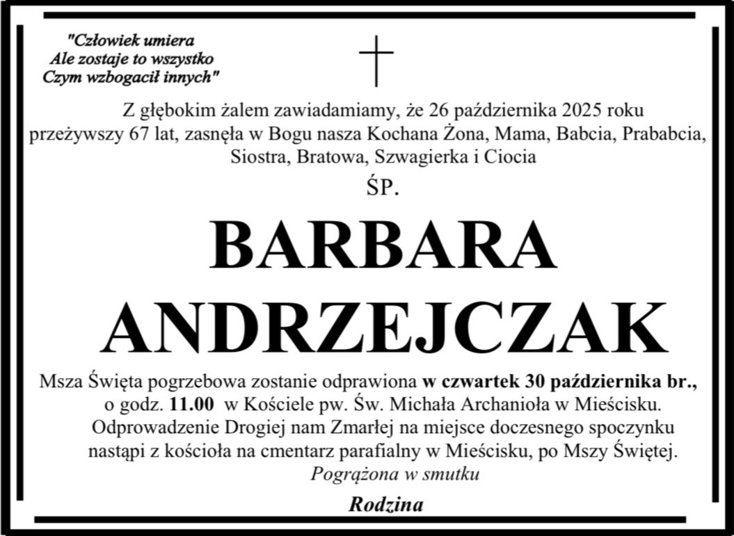 Pogrzeb pani Barbary odbędzie się w piątek 27 stycznia na cmentarzu komunalnym w Wągrowcu.