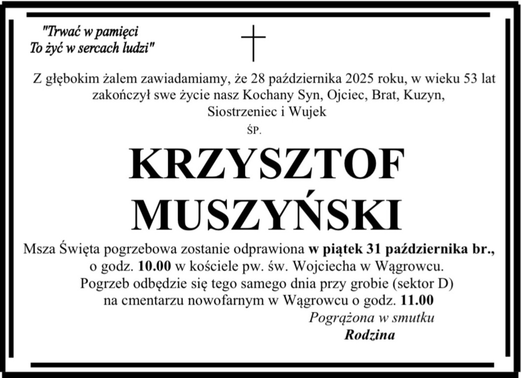 Pogrzeb pana Krzysztofa odbędzie się w sobotę 17 grudnia na cmentarzu nowofarnym w Wągrowcu.