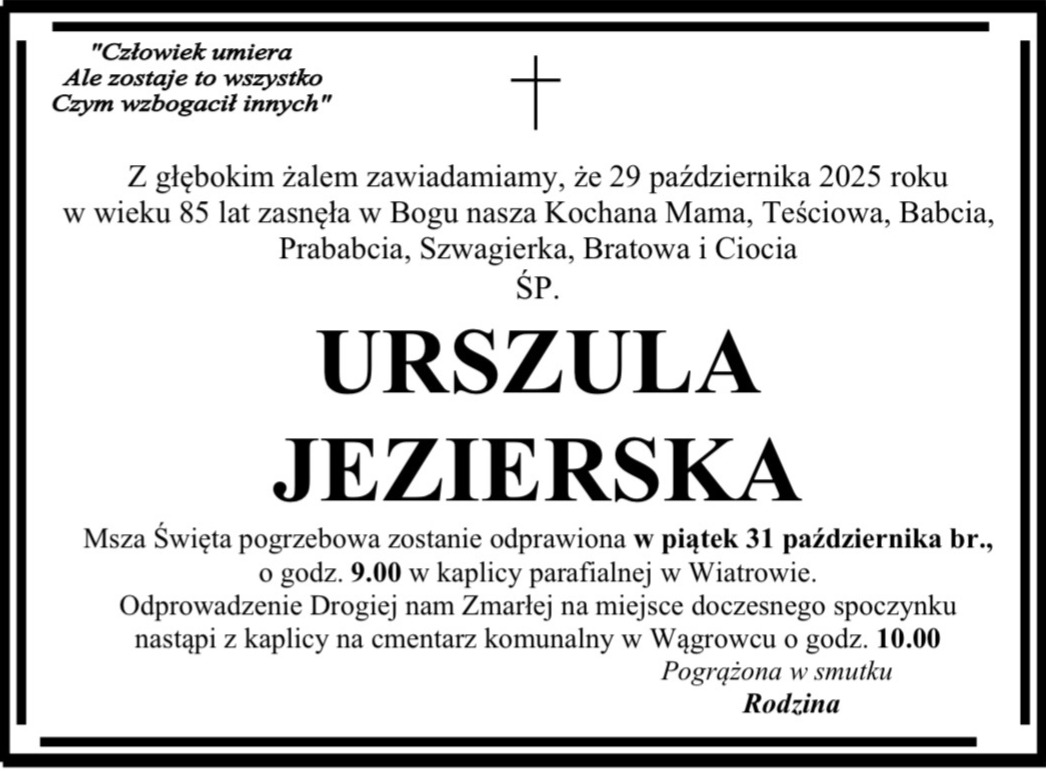 Pogrzeb pani Urszuli odbędzie się we wtorek 17 stycznia na cmentarzu parafialnym w Skokach.
