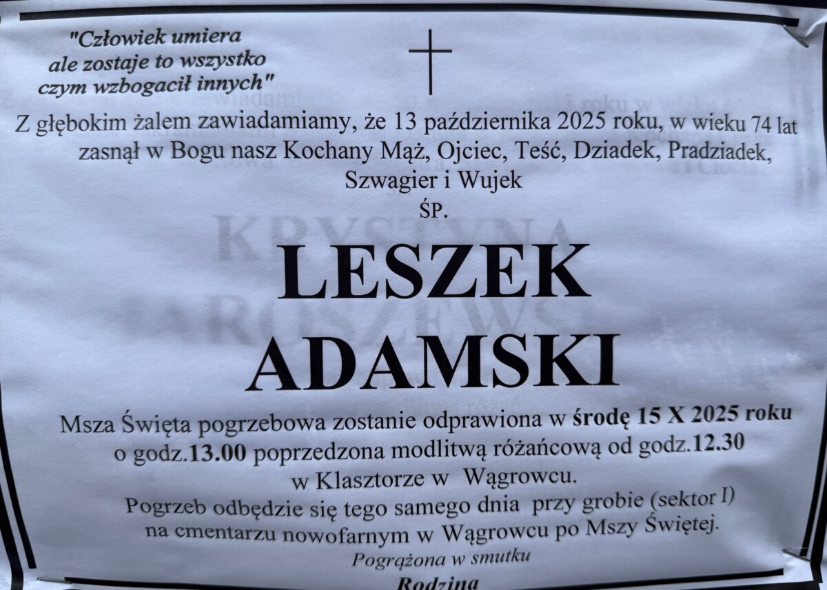 Pogrzeb pani Marii odbędzie się w czwartek 30 marca na cmentarzu komunalnym w Wągrowcu.Pogrzeb pana Marka odbędzie się w piątek 31 marca na cmentarzu komunalnym w Wągrowcu.Pogrzeb pani Małgorzaty odbędzie się we wtorek 28 marca na cmentarzu parafialnym w Popowie Kościelnym.Pogrzeb pani Teresy odbędzie się we wtorek 28 marca na cmentarzu komunalnym w Wągrowcu.Pogrzeb pani Teresy odbędzie się w środę 29 marca na cmentarzu nowofarnym w Wągrowcu.Pogrzeb pani Edwiny odbędzie się w sobotę 25 marca na cmentarzu parafialnym w Żoniu.Pogrzeb pana Stanisława odbędzie się w sobotę 25 marca na cmentarzu nowofarnym w Wągrowcu.Pogrzeb pani Janiny odbędzie się w środę 22 marca na cmentarzu komunalnym w Wągrowcu.Pogrzeb pani Teresy odbędzie się w piątek 24 marca na cmentarzu nowofarnym w Wągrowcu.Pogrzeb pana Henryka odbędzie się we wtorek 21 marca na cmentarzu komunalnym w Wągrowcu.Pogrzeb pani Barbary odbędzie się w piątek 17 marca na cmentarzu nowofarnym w Wągrowcu.Pogrzeb pani Czesławy odbędzie się we wtorek 14 marca na cmentarzu nowofarnym w Wągrowcu.Pogrzeb pana Zygmunta odbędzie się w środę 15 marca na cmentarzu komunalnym w Wągrowcu.Pogrzeb pana Mirosława odbędzie się w piątek 17 marca na cmentarzu komunalnym w Wągrowcu.Pogrzeb pana Joachima odbędzie się we wtorek 14 marca na cmentarzu komunalnym w Wągrowcu.Pogrzeb pana Grzegorza odbędzie się w środę 15 marca na cmentarzu nowofarnym w Wągrowcu.Pogrzeb pana Hieronima odbędzie się we wtorek 14 marca na cmentarzu parafialnym w Skokach.Pogrzeb pani Margarity odbędzie się w poniedziałek 13 marca na cmentarzu nowofarnym w Wągrowcu.Pogrzeb pani Wiesławy odbędzie się w sobotę 11 marca na cmentarzu starofarnym w Wągrowcu.Pogrzeb pani Barbary odbędzie się w czwartek 9 marca na cmentarzu nowofarnym w Wągrowcu.Pogrzeb pani Władysławy odbędzie się w sobotę 11 marca na cmentarzu nowofarnym w Wągrowcu.Pogrzeb pana Piotra odbędzie się w środę 8 marca na cmentarzu komunalnym w Wągrowcu.Pogrzeb pani Aleksandry odbył się we wtorek 7 marca na cmentarzu nowofarnym w Wągrowcu.Pogrzeb pani Danieli odbędzie się w sobotę 11 marca na cmentarzu nowofarnym w Wągrowcu.Pogrzeb pana Pawła odbędzie się w piątek 3 marca na cmentarzu parafialnym w Skokach.Pogrzeb pani Heleny odbędzie się w sobotę 4 marca na cmentarzu starofarnym w Wągrowcu.Pogrzeb pana Kazimierza odbędzie się w sobotę 4 marca na cmentarzu parafialnym w Skokach.Pogrzeb pana Mieczysława odbył się w środę 1 marca na cmentarzu klasztornym w Wągrowcu.Pogrzeb pani Ewy odbędzie się w środę 1 marca na cmentarzu parafialnym w Skokach.Pogrzeb pani Józefy odbędzie się w środę 1 marca na cmentarzu parafialnym w Lechlinie.Pogrzeb pani Władysławy odbędzie się w środę 1 marca na cmentarzu nowofarnym Wągrowcu.Pogrzeb pani Aliny odbędzie się we wtorek 28 lutego na cmentarzu komunalnym Wągrowcu.Pogrzeb pani Krystyny odbędzie się w środę 1 marca na cmentarzu komunalnym Wągrowcu.Pogrzeb pana Bernarda odbędzie się we wtorek 28 lutego na cmentarzu starofarnym Wągrowcu.Pogrzeb pani Zofii odbędzie się we wtorek 28 lutego na cmentarzu nowofarnym w Wągrowcu.Pogrzeb pana Ryszarda odbędzie się w piątek 24 lutego na cmentarzu komunalnym Wągrowcu.Pogrzeb pani Anny odbędzie się w czwartek 23 lutego na cmentarzu nowofarnym Wągrowcu.Pogrzeb pani Barbary odbędzie się w czwartek 23 lutego na cmentarzu nowofarnym Wągrowcu.Pogrzeb pani Ireny odbędzie się w czwartek 23 lutego na cmentarzu nowofarnym Wągrowcu.Pogrzeb pani Czesławy odbędzie się we wtorek 21 lutego na cmentarzu nowofarnym Wągrowcu.Pogrzeb pana Andrzeja odbędzie się w sobotę 18 lutego na cmentarzu nowofarnym Wągrowcu.Pogrzeb pana Czesław odbędzie się w poniedziałek 20 lutego na cmentarzu starofarnym Wągrowcu.Pan Zenon przed laty mieszkał w Wągrowcu. W latach 90-tych wyjechał do USA, ale wciąż ma u nas bliskich i znajomych, z którymi wciąż utrzymywał kontakt. Jego bliskim bardzo zależało, aby poinformować o jego odejściu. Pogrzeb odbędzie się dzisiaj w Nowym Jorku. Pogrzeb pana Tadeusza odbędzie się w piątek 17 lutego na cmentarzu nowofarnym Wągrowcu.Pogrzeb pana Krzysztofa odbył się we wtorek 14 lutego na cmentarzu komunalnym Wągrowcu.Pogrzeb pani Haliny odbędzie się w środę 15 lutego na cmentarzu parafialnym w Czeszewie.Pogrzeb pana Jerzego odbędzie się w środę 15 lutego na cmentarzu komunalnym Wągrowcu.Pogrzeb pana Lechosława odbędzie się we wtorek 114 lutego na cmentarzu parafialnym w Gołańczy.Pogrzeb pani Danuty odbędzie się w sobotę 11 lutego na cmentarzu parafialnym w Lechlinie.Pogrzeb pana Jana odbędzie się w sobotę 11 lutego na cmentarzu komunalnym w Wągrowcu.Pogrzeb pana Kazimierza odbędzie się w środę 8 lutego na cmentarzu nowofarnym w Wągrowcu.Pogrzeb pani Haliny we wtorek 7 lutego na cmentarzu nowofarnym w Wągrowcu.Pogrzeb pana Henryka odbędzie się we środę 8 lutego na cmentarzu komunalnym w Wągrowcu.Pogrzeb pani Urszuli we wtorek 7 lutego na cmentarzu parafialnym w Łeknie.Pogrzeb pani Bożeny odbędzie się we wtorek 7 lutego na cmentarzu komunalnym w Wągrowcu.Pogrzeb pana Kazimierza odbędzie się w poniedziałek 6 lutego na cmentarzu komunalnym w Wągrowcu.Pogrzeb pani Janiny odbędzie się w sobotę 4 lutego na cmentarzu parafialnym w Rogoźnie.Pogrzeb pana Włodzimierza odbędzie się w poniedziałek 6 lutego na cmentarzu komunalnym w Wągrowcu.Pogrzeb pani Marioli odbędzie się w piątek 3 lutego na cmentarzu parafialnym w Potulicach.Pogrzeb pani Danuty odbędzie się w czwartek 2 lutego na cmentarzu klasztornym w Wągrowcu.Pogrzeb pani Gertrudy odbędzie się w czwartek 2 lutego na cmentarzu parafialnym w Żabiczynie.Pogrzeb pana Zdzisława odbędzie się w środę 1 lutego na cmentarzu parafialnym w Gołańczy.Pogrzeb pani Bronisławy odbędzie się w środę 1 lutego na cmentarzu komunalnym w Wągrowcu.Pogrzeb pani Zofii odbył się w poniedzi