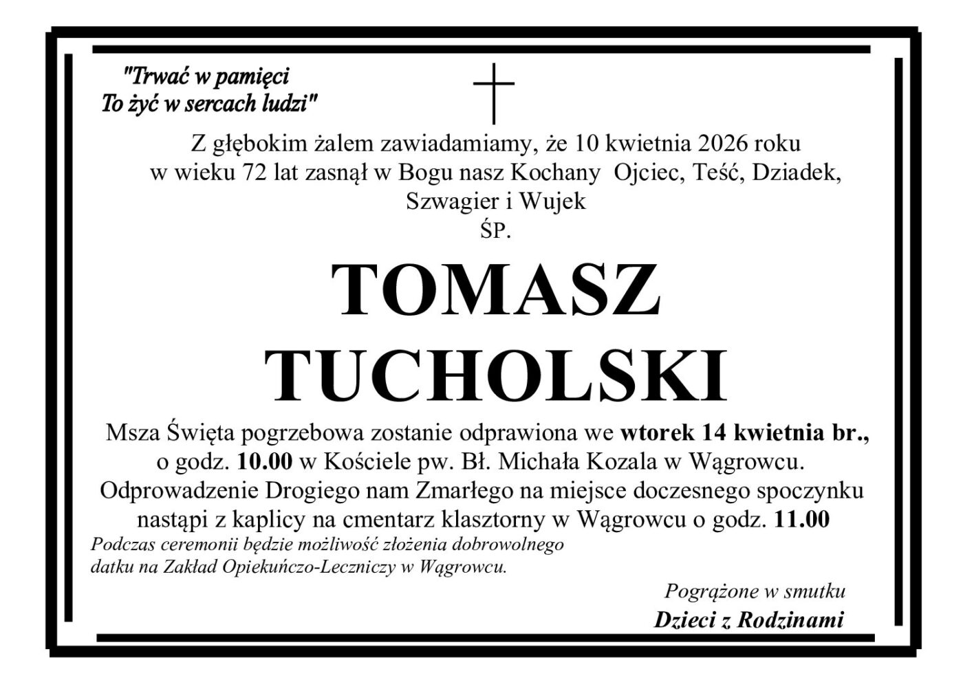 Pogrzeb pana Tadeusza odbędzie się w piątek 17 lutego na cmentarzu nowofarnym Wągrowcu.