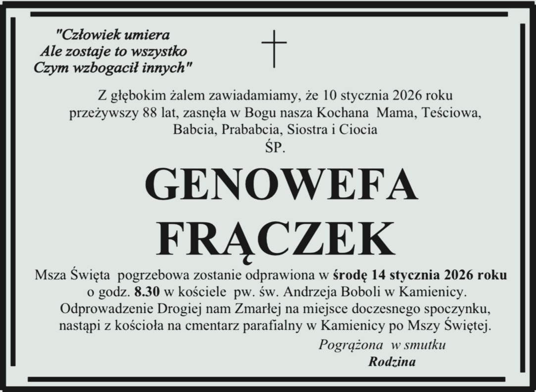 Pogrzeb pani Czesławy odbędzie się we wtorek 21 lutego na cmentarzu nowofarnym Wągrowcu.