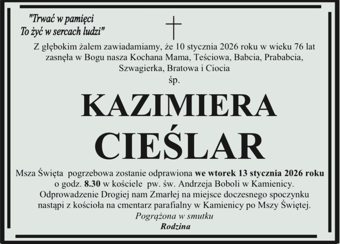 Pogrzeb pani Kazimiery odbędzie się we wtorek 29 listopada na cmentarzu nowofarnym w Wągrowcu.