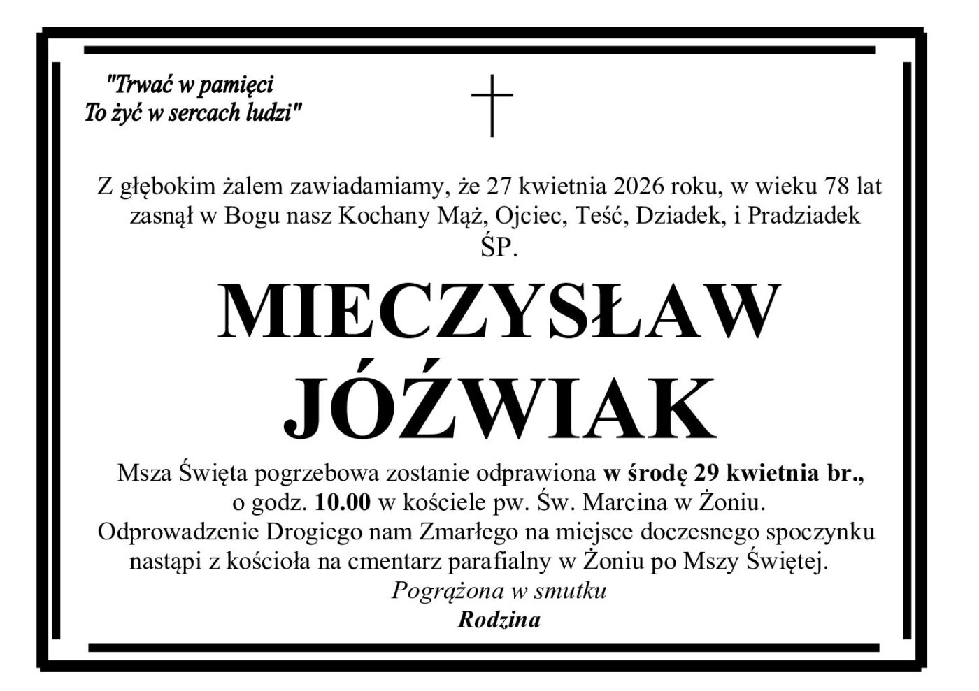 Pogrzeb pana Mieczysława odbędzie się środę 21 grudnia na cmentarzu starofarnym w Wągrowcu.