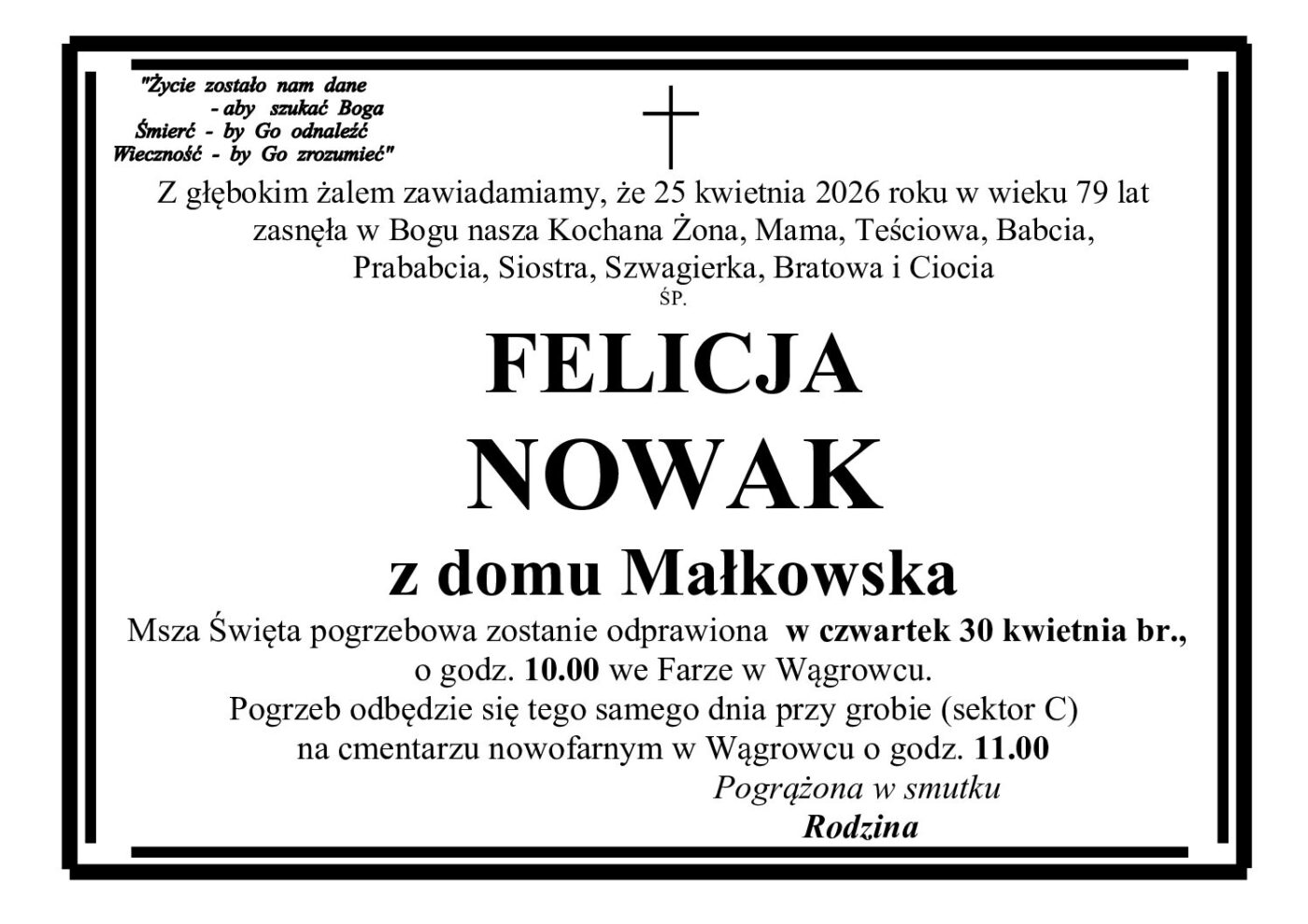 Pogrzeb pani Władysławy odbędzie się w środę 1 marca na cmentarzu nowofarnym Wągrowcu.