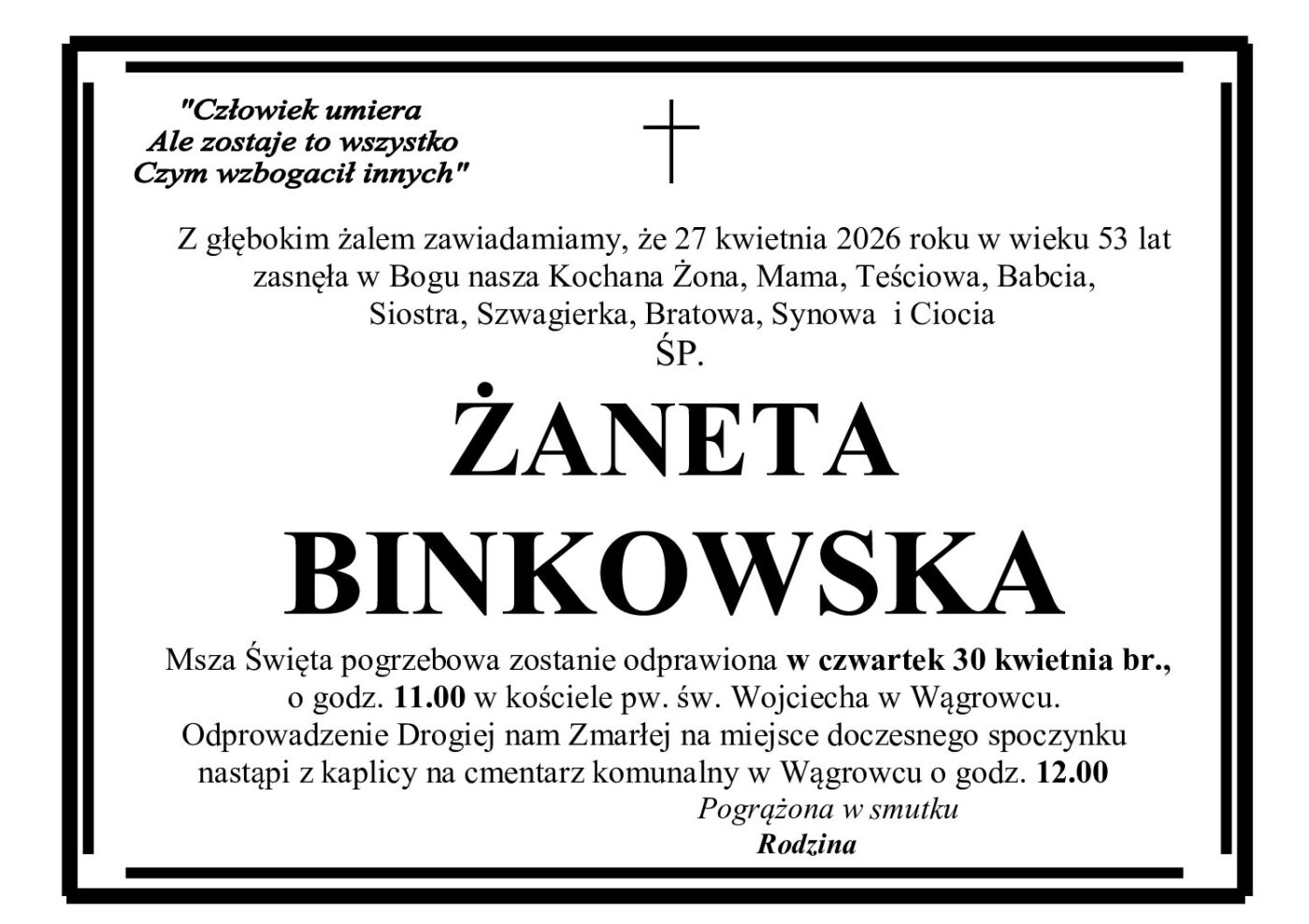 Pogrzeb pani Barbary odbędzie się w czwartek 23 lutego na cmentarzu nowofarnym Wągrowcu.
