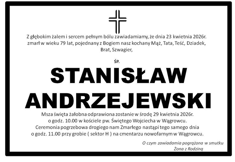 Pogrzeb pana Andrzeja odbędzie się w czwartek 24 listopada na cmentarzu nowofarnym w Wągrowcu.