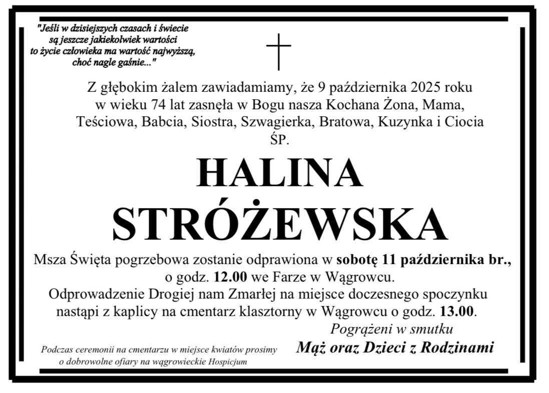 Pogrzeb pani Marii odbędzie się w czwartek 30 marca na cmentarzu komunalnym w Wągrowcu.Pogrzeb pana Marka odbędzie się w piątek 31 marca na cmentarzu komunalnym w Wągrowcu.Pogrzeb pani Małgorzaty odbędzie się we wtorek 28 marca na cmentarzu parafialnym w Popowie Kościelnym.Pogrzeb pani Teresy odbędzie się we wtorek 28 marca na cmentarzu komunalnym w Wągrowcu.Pogrzeb pani Teresy odbędzie się w środę 29 marca na cmentarzu nowofarnym w Wągrowcu.Pogrzeb pani Edwiny odbędzie się w sobotę 25 marca na cmentarzu parafialnym w Żoniu.Pogrzeb pana Stanisława odbędzie się w sobotę 25 marca na cmentarzu nowofarnym w Wągrowcu.Pogrzeb pani Janiny odbędzie się w środę 22 marca na cmentarzu komunalnym w Wągrowcu.Pogrzeb pani Teresy odbędzie się w piątek 24 marca na cmentarzu nowofarnym w Wągrowcu.Pogrzeb pana Henryka odbędzie się we wtorek 21 marca na cmentarzu komunalnym w Wągrowcu.Pogrzeb pani Barbary odbędzie się w piątek 17 marca na cmentarzu nowofarnym w Wągrowcu.Pogrzeb pani Czesławy odbędzie się we wtorek 14 marca na cmentarzu nowofarnym w Wągrowcu.Pogrzeb pana Zygmunta odbędzie się w środę 15 marca na cmentarzu komunalnym w Wągrowcu.Pogrzeb pana Mirosława odbędzie się w piątek 17 marca na cmentarzu komunalnym w Wągrowcu.Pogrzeb pana Joachima odbędzie się we wtorek 14 marca na cmentarzu komunalnym w Wągrowcu.Pogrzeb pana Grzegorza odbędzie się w środę 15 marca na cmentarzu nowofarnym w Wągrowcu.Pogrzeb pana Hieronima odbędzie się we wtorek 14 marca na cmentarzu parafialnym w Skokach.Pogrzeb pani Margarity odbędzie się w poniedziałek 13 marca na cmentarzu nowofarnym w Wągrowcu.Pogrzeb pani Wiesławy odbędzie się w sobotę 11 marca na cmentarzu starofarnym w Wągrowcu.Pogrzeb pani Barbary odbędzie się w czwartek 9 marca na cmentarzu nowofarnym w Wągrowcu.Pogrzeb pani Władysławy odbędzie się w sobotę 11 marca na cmentarzu nowofarnym w Wągrowcu.Pogrzeb pana Piotra odbędzie się w środę 8 marca na cmentarzu komunalnym w Wągrowcu.Pogrzeb pani Aleksandry odbył się we wtorek 7 marca na cmentarzu nowofarnym w Wągrowcu.Pogrzeb pani Danieli odbędzie się w sobotę 11 marca na cmentarzu nowofarnym w Wągrowcu.Pogrzeb pana Pawła odbędzie się w piątek 3 marca na cmentarzu parafialnym w Skokach.Pogrzeb pani Heleny odbędzie się w sobotę 4 marca na cmentarzu starofarnym w Wągrowcu.Pogrzeb pana Kazimierza odbędzie się w sobotę 4 marca na cmentarzu parafialnym w Skokach.Pogrzeb pana Mieczysława odbył się w środę 1 marca na cmentarzu klasztornym w Wągrowcu.Pogrzeb pani Ewy odbędzie się w środę 1 marca na cmentarzu parafialnym w Skokach.Pogrzeb pani Józefy odbędzie się w środę 1 marca na cmentarzu parafialnym w Lechlinie.Pogrzeb pani Władysławy odbędzie się w środę 1 marca na cmentarzu nowofarnym Wągrowcu.Pogrzeb pani Aliny odbędzie się we wtorek 28 lutego na cmentarzu komunalnym Wągrowcu.Pogrzeb pani Krystyny odbędzie się w środę 1 marca na cmentarzu komunalnym Wągrowcu.Pogrzeb pana Bernarda odbędzie się we wtorek 28 lutego na cmentarzu starofarnym Wągrowcu.Pogrzeb pani Zofii odbędzie się we wtorek 28 lutego na cmentarzu nowofarnym w Wągrowcu.Pogrzeb pana Ryszarda odbędzie się w piątek 24 lutego na cmentarzu komunalnym Wągrowcu.Pogrzeb pani Anny odbędzie się w czwartek 23 lutego na cmentarzu nowofarnym Wągrowcu.Pogrzeb pani Barbary odbędzie się w czwartek 23 lutego na cmentarzu nowofarnym Wągrowcu.Pogrzeb pani Ireny odbędzie się w czwartek 23 lutego na cmentarzu nowofarnym Wągrowcu.Pogrzeb pani Czesławy odbędzie się we wtorek 21 lutego na cmentarzu nowofarnym Wągrowcu.Pogrzeb pana Andrzeja odbędzie się w sobotę 18 lutego na cmentarzu nowofarnym Wągrowcu.Pogrzeb pana Czesław odbędzie się w poniedziałek 20 lutego na cmentarzu starofarnym Wągrowcu.Pan Zenon przed laty mieszkał w Wągrowcu. W latach 90-tych wyjechał do USA, ale wciąż ma u nas bliskich i znajomych, z którymi wciąż utrzymywał kontakt. Jego bliskim bardzo zależało, aby poinformować o jego odejściu. Pogrzeb odbędzie się dzisiaj w Nowym Jorku. Pogrzeb pana Tadeusza odbędzie się w piątek 17 lutego na cmentarzu nowofarnym Wągrowcu.Pogrzeb pana Krzysztofa odbył się we wtorek 14 lutego na cmentarzu komunalnym Wągrowcu.Pogrzeb pani Haliny odbędzie się w środę 15 lutego na cmentarzu parafialnym w Czeszewie.Pogrzeb pana Jerzego odbędzie się w środę 15 lutego na cmentarzu komunalnym Wągrowcu.Pogrzeb pana Lechosława odbędzie się we wtorek 114 lutego na cmentarzu parafialnym w Gołańczy.Pogrzeb pani Danuty odbędzie się w sobotę 11 lutego na cmentarzu parafialnym w Lechlinie.Pogrzeb pana Jana odbędzie się w sobotę 11 lutego na cmentarzu komunalnym w Wągrowcu.Pogrzeb pana Kazimierza odbędzie się w środę 8 lutego na cmentarzu nowofarnym w Wągrowcu.Pogrzeb pani Haliny we wtorek 7 lutego na cmentarzu nowofarnym w Wągrowcu.Pogrzeb pana Henryka odbędzie się we środę 8 lutego na cmentarzu komunalnym w Wągrowcu.Pogrzeb pani Urszuli we wtorek 7 lutego na cmentarzu parafialnym w Łeknie.Pogrzeb pani Bożeny odbędzie się we wtorek 7 lutego na cmentarzu komunalnym w Wągrowcu.Pogrzeb pana Kazimierza odbędzie się w poniedziałek 6 lutego na cmentarzu komunalnym w Wągrowcu.Pogrzeb pani Janiny odbędzie się w sobotę 4 lutego na cmentarzu parafialnym w Rogoźnie.Pogrzeb pana Włodzimierza odbędzie się w poniedziałek 6 lutego na cmentarzu komunalnym w Wągrowcu.Pogrzeb pani Marioli odbędzie się w piątek 3 lutego na cmentarzu parafialnym w Potulicach.Pogrzeb pani Danuty odbędzie się w czwartek 2 lutego na cmentarzu klasztornym w Wągrowcu.Pogrzeb pani Gertrudy odbędzie się w czwartek 2 lutego na cmentarzu parafialnym w Żabiczynie.Pogrzeb pana Zdzisława odbędzie się w środę 1 lutego na cmentarzu parafialnym w Gołańczy.Pogrzeb pani Bronisławy odbędzie się w środę 1 lutego na cmentarzu komunalnym w Wągrowcu.Pogrzeb pani Zofii odbył się w poniedzi
