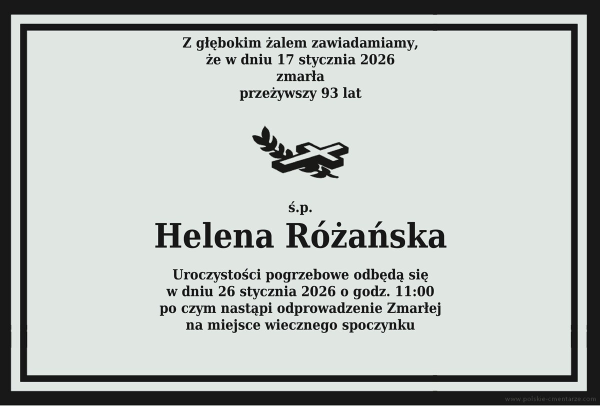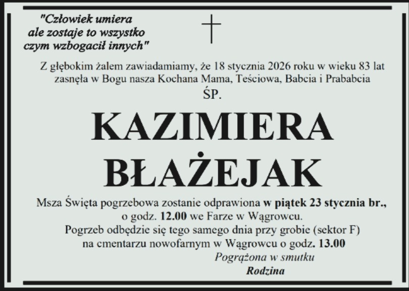 Pogrzeb pani Marii odbędzie się w czwartek 30 marca na cmentarzu komunalnym w Wągrowcu.Pogrzeb pana Marka odbędzie się w piątek 31 marca na cmentarzu komunalnym w Wągrowcu.Pogrzeb pani Małgorzaty odbędzie się we wtorek 28 marca na cmentarzu parafialnym w Popowie Kościelnym.Pogrzeb pani Teresy odbędzie się we wtorek 28 marca na cmentarzu komunalnym w Wągrowcu.Pogrzeb pani Teresy odbędzie się w środę 29 marca na cmentarzu nowofarnym w Wągrowcu.Pogrzeb pani Edwiny odbędzie się w sobotę 25 marca na cmentarzu parafialnym w Żoniu.Pogrzeb pana Stanisława odbędzie się w sobotę 25 marca na cmentarzu nowofarnym w Wągrowcu.Pogrzeb pani Janiny odbędzie się w środę 22 marca na cmentarzu komunalnym w Wągrowcu.Pogrzeb pani Teresy odbędzie się w piątek 24 marca na cmentarzu nowofarnym w Wągrowcu.Pogrzeb pana Henryka odbędzie się we wtorek 21 marca na cmentarzu komunalnym w Wągrowcu.Pogrzeb pani Barbary odbędzie się w piątek 17 marca na cmentarzu nowofarnym w Wągrowcu.Pogrzeb pani Czesławy odbędzie się we wtorek 14 marca na cmentarzu nowofarnym w Wągrowcu.Pogrzeb pana Zygmunta odbędzie się w środę 15 marca na cmentarzu komunalnym w Wągrowcu.Pogrzeb pana Mirosława odbędzie się w piątek 17 marca na cmentarzu komunalnym w Wągrowcu.Pogrzeb pana Joachima odbędzie się we wtorek 14 marca na cmentarzu komunalnym w Wągrowcu.Pogrzeb pana Grzegorza odbędzie się w środę 15 marca na cmentarzu nowofarnym w Wągrowcu.Pogrzeb pana Hieronima odbędzie się we wtorek 14 marca na cmentarzu parafialnym w Skokach.Pogrzeb pani Margarity odbędzie się w poniedziałek 13 marca na cmentarzu nowofarnym w Wągrowcu.Pogrzeb pani Wiesławy odbędzie się w sobotę 11 marca na cmentarzu starofarnym w Wągrowcu.Pogrzeb pani Barbary odbędzie się w czwartek 9 marca na cmentarzu nowofarnym w Wągrowcu.Pogrzeb pani Władysławy odbędzie się w sobotę 11 marca na cmentarzu nowofarnym w Wągrowcu.Pogrzeb pana Piotra odbędzie się w środę 8 marca na cmentarzu komunalnym w Wągrowcu.Pogrzeb pani Aleksandry odbył się we wtorek 7 marca na cmentarzu nowofarnym w Wągrowcu.Pogrzeb pani Danieli odbędzie się w sobotę 11 marca na cmentarzu nowofarnym w Wągrowcu.Pogrzeb pana Pawła odbędzie się w piątek 3 marca na cmentarzu parafialnym w Skokach.Pogrzeb pani Heleny odbędzie się w sobotę 4 marca na cmentarzu starofarnym w Wągrowcu.Pogrzeb pana Kazimierza odbędzie się w sobotę 4 marca na cmentarzu parafialnym w Skokach.Pogrzeb pana Mieczysława odbył się w środę 1 marca na cmentarzu klasztornym w Wągrowcu.Pogrzeb pani Ewy odbędzie się w środę 1 marca na cmentarzu parafialnym w Skokach.Pogrzeb pani Józefy odbędzie się w środę 1 marca na cmentarzu parafialnym w Lechlinie.Pogrzeb pani Władysławy odbędzie się w środę 1 marca na cmentarzu nowofarnym Wągrowcu.Pogrzeb pani Aliny odbędzie się we wtorek 28 lutego na cmentarzu komunalnym Wągrowcu.Pogrzeb pani Krystyny odbędzie się w środę 1 marca na cmentarzu komunalnym Wągrowcu.Pogrzeb pana Bernarda odbędzie się we wtorek 28 lutego na cmentarzu starofarnym Wągrowcu.Pogrzeb pani Zofii odbędzie się we wtorek 28 lutego na cmentarzu nowofarnym w Wągrowcu.Pogrzeb pana Ryszarda odbędzie się w piątek 24 lutego na cmentarzu komunalnym Wągrowcu.Pogrzeb pani Anny odbędzie się w czwartek 23 lutego na cmentarzu nowofarnym Wągrowcu.Pogrzeb pani Barbary odbędzie się w czwartek 23 lutego na cmentarzu nowofarnym Wągrowcu.Pogrzeb pani Ireny odbędzie się w czwartek 23 lutego na cmentarzu nowofarnym Wągrowcu.Pogrzeb pani Czesławy odbędzie się we wtorek 21 lutego na cmentarzu nowofarnym Wągrowcu.Pogrzeb pana Andrzeja odbędzie się w sobotę 18 lutego na cmentarzu nowofarnym Wągrowcu.Pogrzeb pana Czesław odbędzie się w poniedziałek 20 lutego na cmentarzu starofarnym Wągrowcu.Pan Zenon przed laty mieszkał w Wągrowcu. W latach 90-tych wyjechał do USA, ale wciąż ma u nas bliskich i znajomych, z którymi wciąż utrzymywał kontakt. Jego bliskim bardzo zależało, aby poinformować o jego odejściu. Pogrzeb odbędzie się dzisiaj w Nowym Jorku. Pogrzeb pana Tadeusza odbędzie się w piątek 17 lutego na cmentarzu nowofarnym Wągrowcu.Pogrzeb pana Krzysztofa odbył się we wtorek 14 lutego na cmentarzu komunalnym Wągrowcu.Pogrzeb pani Haliny odbędzie się w środę 15 lutego na cmentarzu parafialnym w Czeszewie.Pogrzeb pana Jerzego odbędzie się w środę 15 lutego na cmentarzu komunalnym Wągrowcu.Pogrzeb pana Lechosława odbędzie się we wtorek 114 lutego na cmentarzu parafialnym w Gołańczy.Pogrzeb pani Danuty odbędzie się w sobotę 11 lutego na cmentarzu parafialnym w Lechlinie.Pogrzeb pana Jana odbędzie się w sobotę 11 lutego na cmentarzu komunalnym w Wągrowcu.Pogrzeb pana Kazimierza odbędzie się w środę 8 lutego na cmentarzu nowofarnym w Wągrowcu.Pogrzeb pani Haliny we wtorek 7 lutego na cmentarzu nowofarnym w Wągrowcu.Pogrzeb pana Henryka odbędzie się we środę 8 lutego na cmentarzu komunalnym w Wągrowcu.Pogrzeb pani Urszuli we wtorek 7 lutego na cmentarzu parafialnym w Łeknie.Pogrzeb pani Bożeny odbędzie się we wtorek 7 lutego na cmentarzu komunalnym w Wągrowcu.Pogrzeb pana Kazimierza odbędzie się w poniedziałek 6 lutego na cmentarzu komunalnym w Wągrowcu.Pogrzeb pani Janiny odbędzie się w sobotę 4 lutego na cmentarzu parafialnym w Rogoźnie.Pogrzeb pana Włodzimierza odbędzie się w poniedziałek 6 lutego na cmentarzu komunalnym w Wągrowcu.Pogrzeb pani Marioli odbędzie się w piątek 3 lutego na cmentarzu parafialnym w Potulicach.Pogrzeb pani Danuty odbędzie się w czwartek 2 lutego na cmentarzu klasztornym w Wągrowcu.Pogrzeb pani Gertrudy odbędzie się w czwartek 2 lutego na cmentarzu parafialnym w Żabiczynie.Pogrzeb pana Zdzisława odbędzie się w środę 1 lutego na cmentarzu parafialnym w Gołańczy.Pogrzeb pani Bronisławy odbędzie się w środę 1 lutego na cmentarzu komunalnym w Wągrowcu.Pogrzeb pani Zofii odbył się w poniedzi