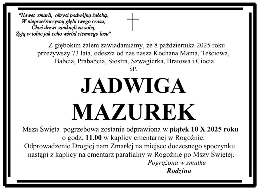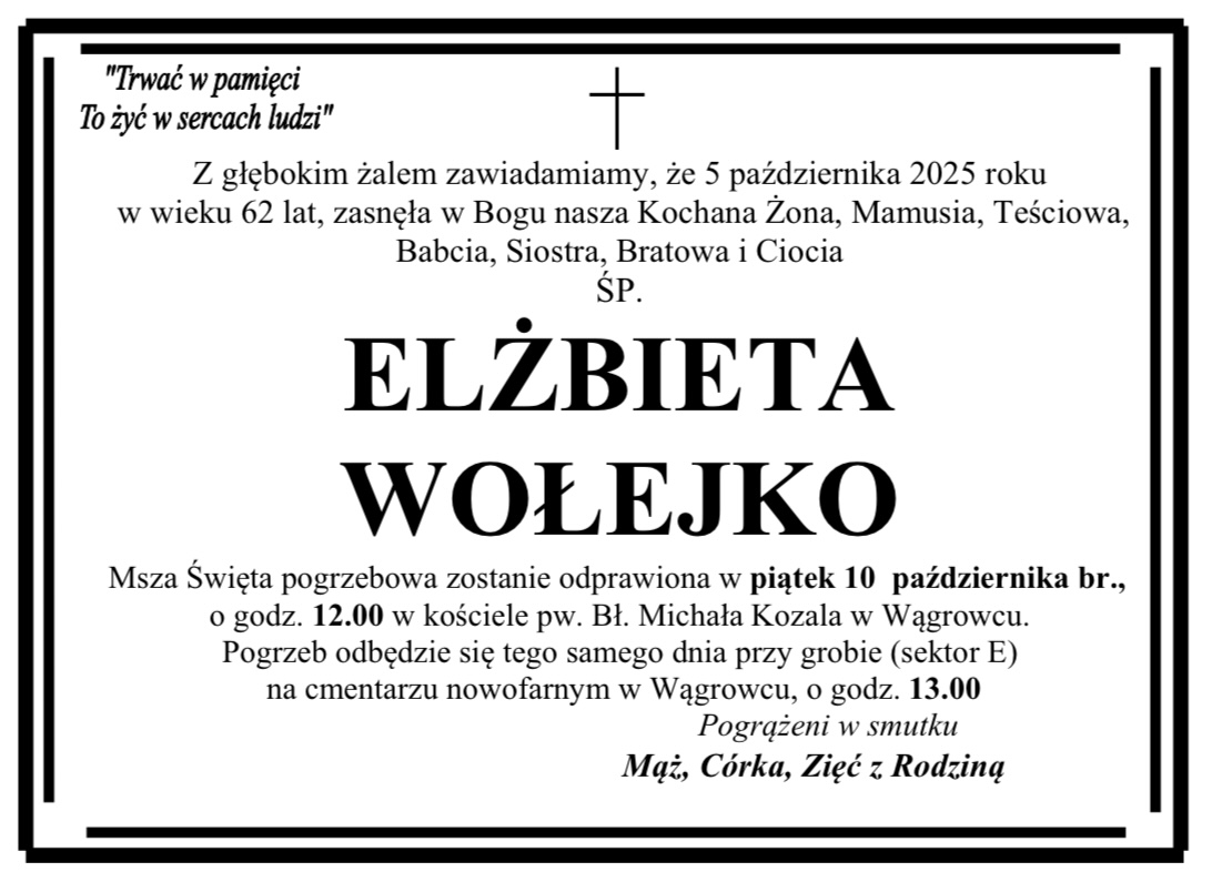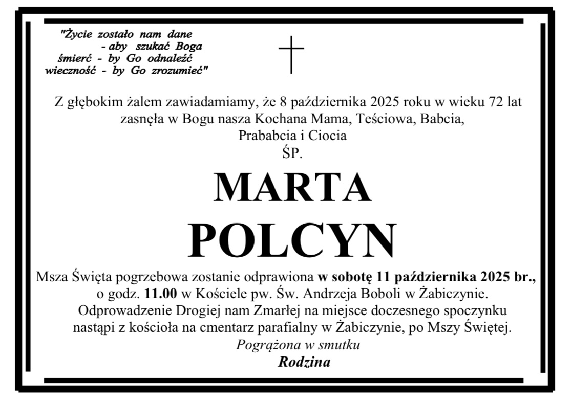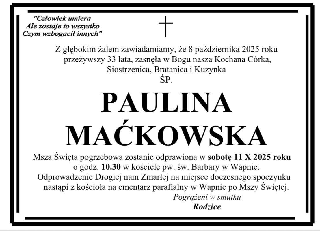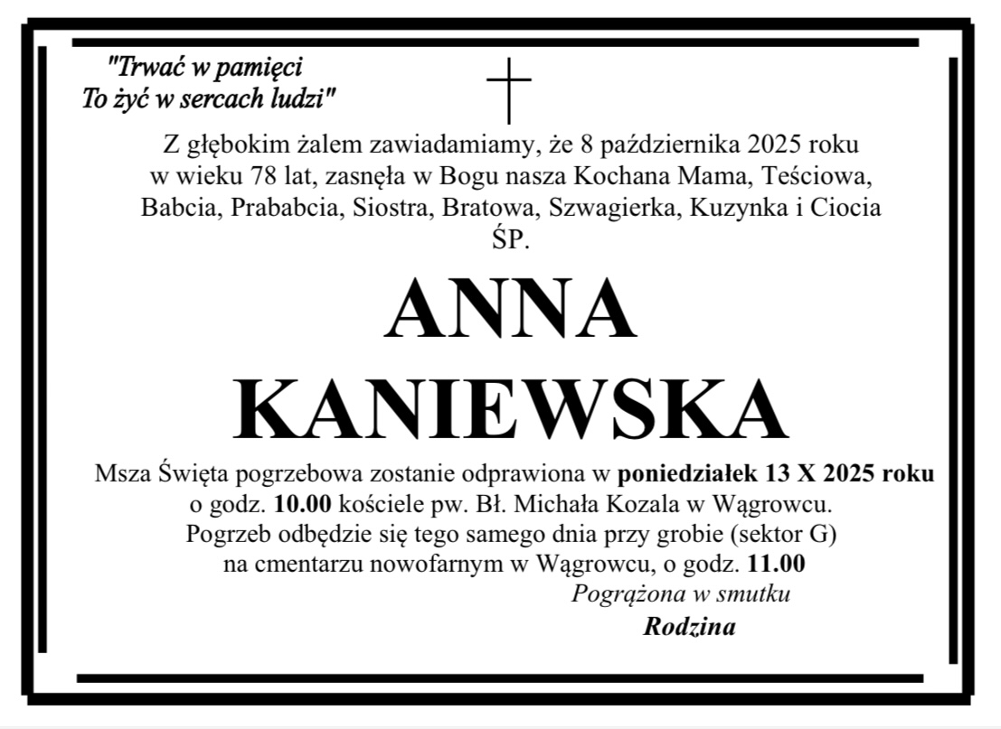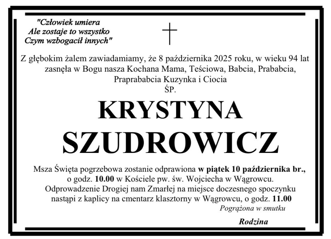 Pogrzeb pani Marii odbędzie się w czwartek 30 marca na cmentarzu komunalnym w Wągrowcu.Pogrzeb pana Marka odbędzie się w piątek 31 marca na cmentarzu komunalnym w Wągrowcu.Pogrzeb pani Małgorzaty odbędzie się we wtorek 28 marca na cmentarzu parafialnym w Popowie Kościelnym.Pogrzeb pani Teresy odbędzie się we wtorek 28 marca na cmentarzu komunalnym w Wągrowcu.Pogrzeb pani Teresy odbędzie się w środę 29 marca na cmentarzu nowofarnym w Wągrowcu.Pogrzeb pani Edwiny odbędzie się w sobotę 25 marca na cmentarzu parafialnym w Żoniu.Pogrzeb pana Stanisława odbędzie się w sobotę 25 marca na cmentarzu nowofarnym w Wągrowcu.Pogrzeb pani Janiny odbędzie się w środę 22 marca na cmentarzu komunalnym w Wągrowcu.Pogrzeb pani Teresy odbędzie się w piątek 24 marca na cmentarzu nowofarnym w Wągrowcu.Pogrzeb pana Henryka odbędzie się we wtorek 21 marca na cmentarzu komunalnym w Wągrowcu.Pogrzeb pani Barbary odbędzie się w piątek 17 marca na cmentarzu nowofarnym w Wągrowcu.Pogrzeb pani Czesławy odbędzie się we wtorek 14 marca na cmentarzu nowofarnym w Wągrowcu.Pogrzeb pana Zygmunta odbędzie się w środę 15 marca na cmentarzu komunalnym w Wągrowcu.Pogrzeb pana Mirosława odbędzie się w piątek 17 marca na cmentarzu komunalnym w Wągrowcu.Pogrzeb pana Joachima odbędzie się we wtorek 14 marca na cmentarzu komunalnym w Wągrowcu.Pogrzeb pana Grzegorza odbędzie się w środę 15 marca na cmentarzu nowofarnym w Wągrowcu.Pogrzeb pana Hieronima odbędzie się we wtorek 14 marca na cmentarzu parafialnym w Skokach.Pogrzeb pani Margarity odbędzie się w poniedziałek 13 marca na cmentarzu nowofarnym w Wągrowcu.Pogrzeb pani Wiesławy odbędzie się w sobotę 11 marca na cmentarzu starofarnym w Wągrowcu.Pogrzeb pani Barbary odbędzie się w czwartek 9 marca na cmentarzu nowofarnym w Wągrowcu.Pogrzeb pani Władysławy odbędzie się w sobotę 11 marca na cmentarzu nowofarnym w Wągrowcu.Pogrzeb pana Piotra odbędzie się w środę 8 marca na cmentarzu komunalnym w Wągrowcu.Pogrzeb pani Aleksandry odbył się we wtorek 7 marca na cmentarzu nowofarnym w Wągrowcu.Pogrzeb pani Danieli odbędzie się w sobotę 11 marca na cmentarzu nowofarnym w Wągrowcu.Pogrzeb pana Pawła odbędzie się w piątek 3 marca na cmentarzu parafialnym w Skokach.Pogrzeb pani Heleny odbędzie się w sobotę 4 marca na cmentarzu starofarnym w Wągrowcu.Pogrzeb pana Kazimierza odbędzie się w sobotę 4 marca na cmentarzu parafialnym w Skokach.Pogrzeb pana Mieczysława odbył się w środę 1 marca na cmentarzu klasztornym w Wągrowcu.Pogrzeb pani Ewy odbędzie się w środę 1 marca na cmentarzu parafialnym w Skokach.Pogrzeb pani Józefy odbędzie się w środę 1 marca na cmentarzu parafialnym w Lechlinie.Pogrzeb pani Władysławy odbędzie się w środę 1 marca na cmentarzu nowofarnym Wągrowcu.Pogrzeb pani Aliny odbędzie się we wtorek 28 lutego na cmentarzu komunalnym Wągrowcu.Pogrzeb pani Krystyny odbędzie się w środę 1 marca na cmentarzu komunalnym Wągrowcu.Pogrzeb pana Bernarda odbędzie się we wtorek 28 lutego na cmentarzu starofarnym Wągrowcu.Pogrzeb pani Zofii odbędzie się we wtorek 28 lutego na cmentarzu nowofarnym w Wągrowcu.Pogrzeb pana Ryszarda odbędzie się w piątek 24 lutego na cmentarzu komunalnym Wągrowcu.Pogrzeb pani Anny odbędzie się w czwartek 23 lutego na cmentarzu nowofarnym Wągrowcu.Pogrzeb pani Barbary odbędzie się w czwartek 23 lutego na cmentarzu nowofarnym Wągrowcu.Pogrzeb pani Ireny odbędzie się w czwartek 23 lutego na cmentarzu nowofarnym Wągrowcu.Pogrzeb pani Czesławy odbędzie się we wtorek 21 lutego na cmentarzu nowofarnym Wągrowcu.Pogrzeb pana Andrzeja odbędzie się w sobotę 18 lutego na cmentarzu nowofarnym Wągrowcu.Pogrzeb pana Czesław odbędzie się w poniedziałek 20 lutego na cmentarzu starofarnym Wągrowcu.Pan Zenon przed laty mieszkał w Wągrowcu. W latach 90-tych wyjechał do USA, ale wciąż ma u nas bliskich i znajomych, z którymi wciąż utrzymywał kontakt. Jego bliskim bardzo zależało, aby poinformować o jego odejściu. Pogrzeb odbędzie się dzisiaj w Nowym Jorku. Pogrzeb pana Tadeusza odbędzie się w piątek 17 lutego na cmentarzu nowofarnym Wągrowcu.Pogrzeb pana Krzysztofa odbył się we wtorek 14 lutego na cmentarzu komunalnym Wągrowcu.Pogrzeb pani Haliny odbędzie się w środę 15 lutego na cmentarzu parafialnym w Czeszewie.Pogrzeb pana Jerzego odbędzie się w środę 15 lutego na cmentarzu komunalnym Wągrowcu.Pogrzeb pana Lechosława odbędzie się we wtorek 114 lutego na cmentarzu parafialnym w Gołańczy.Pogrzeb pani Danuty odbędzie się w sobotę 11 lutego na cmentarzu parafialnym w Lechlinie.Pogrzeb pana Jana odbędzie się w sobotę 11 lutego na cmentarzu komunalnym w Wągrowcu.Pogrzeb pana Kazimierza odbędzie się w środę 8 lutego na cmentarzu nowofarnym w Wągrowcu.Pogrzeb pani Haliny we wtorek 7 lutego na cmentarzu nowofarnym w Wągrowcu.Pogrzeb pana Henryka odbędzie się we środę 8 lutego na cmentarzu komunalnym w Wągrowcu.Pogrzeb pani Urszuli we wtorek 7 lutego na cmentarzu parafialnym w Łeknie.Pogrzeb pani Bożeny odbędzie się we wtorek 7 lutego na cmentarzu komunalnym w Wągrowcu.Pogrzeb pana Kazimierza odbędzie się w poniedziałek 6 lutego na cmentarzu komunalnym w Wągrowcu.Pogrzeb pani Janiny odbędzie się w sobotę 4 lutego na cmentarzu parafialnym w Rogoźnie.Pogrzeb pana Włodzimierza odbędzie się w poniedziałek 6 lutego na cmentarzu komunalnym w Wągrowcu.Pogrzeb pani Marioli odbędzie się w piątek 3 lutego na cmentarzu parafialnym w Potulicach.Pogrzeb pani Danuty odbędzie się w czwartek 2 lutego na cmentarzu klasztornym w Wągrowcu.Pogrzeb pani Gertrudy odbędzie się w czwartek 2 lutego na cmentarzu parafialnym w Żabiczynie.Pogrzeb pana Zdzisława odbędzie się w środę 1 lutego na cmentarzu parafialnym w Gołańczy.Pogrzeb pani Bronisławy odbędzie się w środę 1 lutego na cmentarzu komunalnym w Wągrowcu.Pogrzeb pani Zofii odbył się w poniedzi
