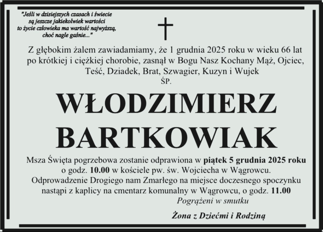Pogrzeb pani Marii odbędzie się w czwartek 30 marca na cmentarzu komunalnym w Wągrowcu.Pogrzeb pana Marka odbędzie się w piątek 31 marca na cmentarzu komunalnym w Wągrowcu.Pogrzeb pani Małgorzaty odbędzie się we wtorek 28 marca na cmentarzu parafialnym w Popowie Kościelnym.Pogrzeb pani Teresy odbędzie się we wtorek 28 marca na cmentarzu komunalnym w Wągrowcu.Pogrzeb pani Teresy odbędzie się w środę 29 marca na cmentarzu nowofarnym w Wągrowcu.Pogrzeb pani Edwiny odbędzie się w sobotę 25 marca na cmentarzu parafialnym w Żoniu.Pogrzeb pana Stanisława odbędzie się w sobotę 25 marca na cmentarzu nowofarnym w Wągrowcu.Pogrzeb pani Janiny odbędzie się w środę 22 marca na cmentarzu komunalnym w Wągrowcu.Pogrzeb pani Teresy odbędzie się w piątek 24 marca na cmentarzu nowofarnym w Wągrowcu.Pogrzeb pana Henryka odbędzie się we wtorek 21 marca na cmentarzu komunalnym w Wągrowcu.Pogrzeb pani Barbary odbędzie się w piątek 17 marca na cmentarzu nowofarnym w Wągrowcu.Pogrzeb pani Czesławy odbędzie się we wtorek 14 marca na cmentarzu nowofarnym w Wągrowcu.Pogrzeb pana Zygmunta odbędzie się w środę 15 marca na cmentarzu komunalnym w Wągrowcu.Pogrzeb pana Mirosława odbędzie się w piątek 17 marca na cmentarzu komunalnym w Wągrowcu.Pogrzeb pana Joachima odbędzie się we wtorek 14 marca na cmentarzu komunalnym w Wągrowcu.Pogrzeb pana Grzegorza odbędzie się w środę 15 marca na cmentarzu nowofarnym w Wągrowcu.Pogrzeb pana Hieronima odbędzie się we wtorek 14 marca na cmentarzu parafialnym w Skokach.Pogrzeb pani Margarity odbędzie się w poniedziałek 13 marca na cmentarzu nowofarnym w Wągrowcu.Pogrzeb pani Wiesławy odbędzie się w sobotę 11 marca na cmentarzu starofarnym w Wągrowcu.Pogrzeb pani Barbary odbędzie się w czwartek 9 marca na cmentarzu nowofarnym w Wągrowcu.Pogrzeb pani Władysławy odbędzie się w sobotę 11 marca na cmentarzu nowofarnym w Wągrowcu.Pogrzeb pana Piotra odbędzie się w środę 8 marca na cmentarzu komunalnym w Wągrowcu.Pogrzeb pani Aleksandry odbył się we wtorek 7 marca na cmentarzu nowofarnym w Wągrowcu.Pogrzeb pani Danieli odbędzie się w sobotę 11 marca na cmentarzu nowofarnym w Wągrowcu.Pogrzeb pana Pawła odbędzie się w piątek 3 marca na cmentarzu parafialnym w Skokach.Pogrzeb pani Heleny odbędzie się w sobotę 4 marca na cmentarzu starofarnym w Wągrowcu.Pogrzeb pana Kazimierza odbędzie się w sobotę 4 marca na cmentarzu parafialnym w Skokach.Pogrzeb pana Mieczysława odbył się w środę 1 marca na cmentarzu klasztornym w Wągrowcu.Pogrzeb pani Ewy odbędzie się w środę 1 marca na cmentarzu parafialnym w Skokach.Pogrzeb pani Józefy odbędzie się w środę 1 marca na cmentarzu parafialnym w Lechlinie.Pogrzeb pani Władysławy odbędzie się w środę 1 marca na cmentarzu nowofarnym Wągrowcu.Pogrzeb pani Aliny odbędzie się we wtorek 28 lutego na cmentarzu komunalnym Wągrowcu.Pogrzeb pani Krystyny odbędzie się w środę 1 marca na cmentarzu komunalnym Wągrowcu.Pogrzeb pana Bernarda odbędzie się we wtorek 28 lutego na cmentarzu starofarnym Wągrowcu.Pogrzeb pani Zofii odbędzie się we wtorek 28 lutego na cmentarzu nowofarnym w Wągrowcu.Pogrzeb pana Ryszarda odbędzie się w piątek 24 lutego na cmentarzu komunalnym Wągrowcu.Pogrzeb pani Anny odbędzie się w czwartek 23 lutego na cmentarzu nowofarnym Wągrowcu.Pogrzeb pani Barbary odbędzie się w czwartek 23 lutego na cmentarzu nowofarnym Wągrowcu.Pogrzeb pani Ireny odbędzie się w czwartek 23 lutego na cmentarzu nowofarnym Wągrowcu.Pogrzeb pani Czesławy odbędzie się we wtorek 21 lutego na cmentarzu nowofarnym Wągrowcu.Pogrzeb pana Andrzeja odbędzie się w sobotę 18 lutego na cmentarzu nowofarnym Wągrowcu.Pogrzeb pana Czesław odbędzie się w poniedziałek 20 lutego na cmentarzu starofarnym Wągrowcu.Pan Zenon przed laty mieszkał w Wągrowcu. W latach 90-tych wyjechał do USA, ale wciąż ma u nas bliskich i znajomych, z którymi wciąż utrzymywał kontakt. Jego bliskim bardzo zależało, aby poinformować o jego odejściu. Pogrzeb odbędzie się dzisiaj w Nowym Jorku. Pogrzeb pana Tadeusza odbędzie się w piątek 17 lutego na cmentarzu nowofarnym Wągrowcu.Pogrzeb pana Krzysztofa odbył się we wtorek 14 lutego na cmentarzu komunalnym Wągrowcu.Pogrzeb pani Haliny odbędzie się w środę 15 lutego na cmentarzu parafialnym w Czeszewie.Pogrzeb pana Jerzego odbędzie się w środę 15 lutego na cmentarzu komunalnym Wągrowcu.Pogrzeb pana Lechosława odbędzie się we wtorek 114 lutego na cmentarzu parafialnym w Gołańczy.Pogrzeb pani Danuty odbędzie się w sobotę 11 lutego na cmentarzu parafialnym w Lechlinie.Pogrzeb pana Jana odbędzie się w sobotę 11 lutego na cmentarzu komunalnym w Wągrowcu.Pogrzeb pana Kazimierza odbędzie się w środę 8 lutego na cmentarzu nowofarnym w Wągrowcu.Pogrzeb pani Haliny we wtorek 7 lutego na cmentarzu nowofarnym w Wągrowcu.Pogrzeb pana Henryka odbędzie się we środę 8 lutego na cmentarzu komunalnym w Wągrowcu.Pogrzeb pani Urszuli we wtorek 7 lutego na cmentarzu parafialnym w Łeknie.Pogrzeb pani Bożeny odbędzie się we wtorek 7 lutego na cmentarzu komunalnym w Wągrowcu.Pogrzeb pana Kazimierza odbędzie się w poniedziałek 6 lutego na cmentarzu komunalnym w Wągrowcu.Pogrzeb pani Janiny odbędzie się w sobotę 4 lutego na cmentarzu parafialnym w Rogoźnie.Pogrzeb pana Włodzimierza odbędzie się w poniedziałek 6 lutego na cmentarzu komunalnym w Wągrowcu.Pogrzeb pani Marioli odbędzie się w piątek 3 lutego na cmentarzu parafialnym w Potulicach.Pogrzeb pani Danuty odbędzie się w czwartek 2 lutego na cmentarzu klasztornym w Wągrowcu.Pogrzeb pani Gertrudy odbędzie się w czwartek 2 lutego na cmentarzu parafialnym w Żabiczynie.Pogrzeb pana Zdzisława odbędzie się w środę 1 lutego na cmentarzu parafialnym w Gołańczy.Pogrzeb pani Bronisławy odbędzie się w środę 1 lutego na cmentarzu komunalnym w Wągrowcu.Pogrzeb pani Zofii odbył się w poniedzi