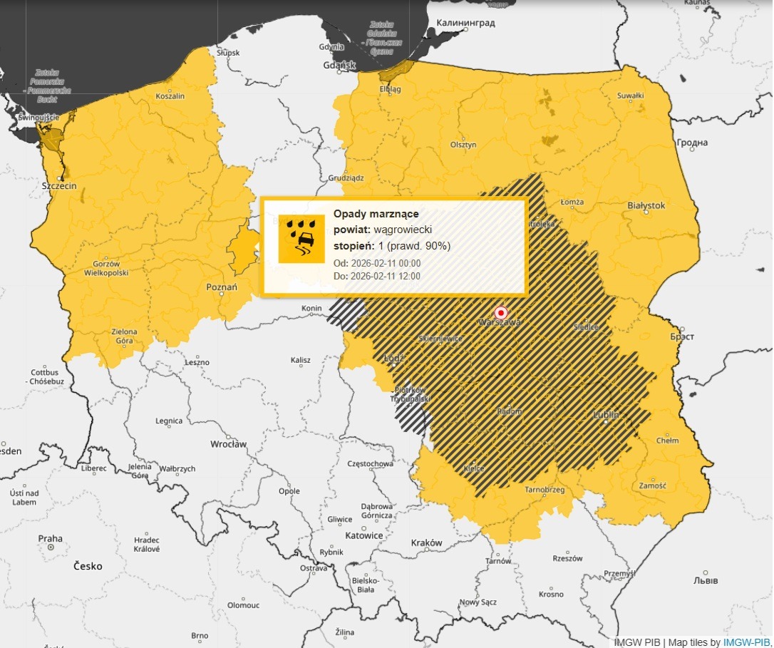 Ostrzeżenie obowiązuje od północy, czyli środy, 11 lutego, od godziny 0.00 i potrwa do jutrzejszego południa, środa 11 lutego, do godziny 12.00.