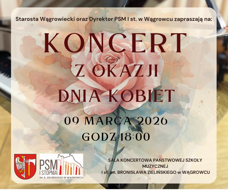 Starosta Wągrowiecki Tomasz Kranc oraz Dyrektor Państwowej Szkoły Muzycznej I stopnia im. Bronisława Zielińskiego w Wągrowcu Marek Rybarczyk zapraszają nie tylko panie na wyjątkowy koncert z okazji Dnia Kobiet.
