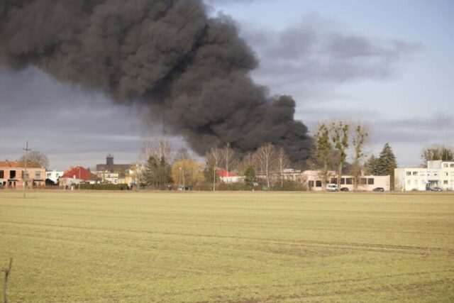 Nad miastem unoszą się kłęby czarnego dymu, który jest widoczny z odległości wielu kilometrów.