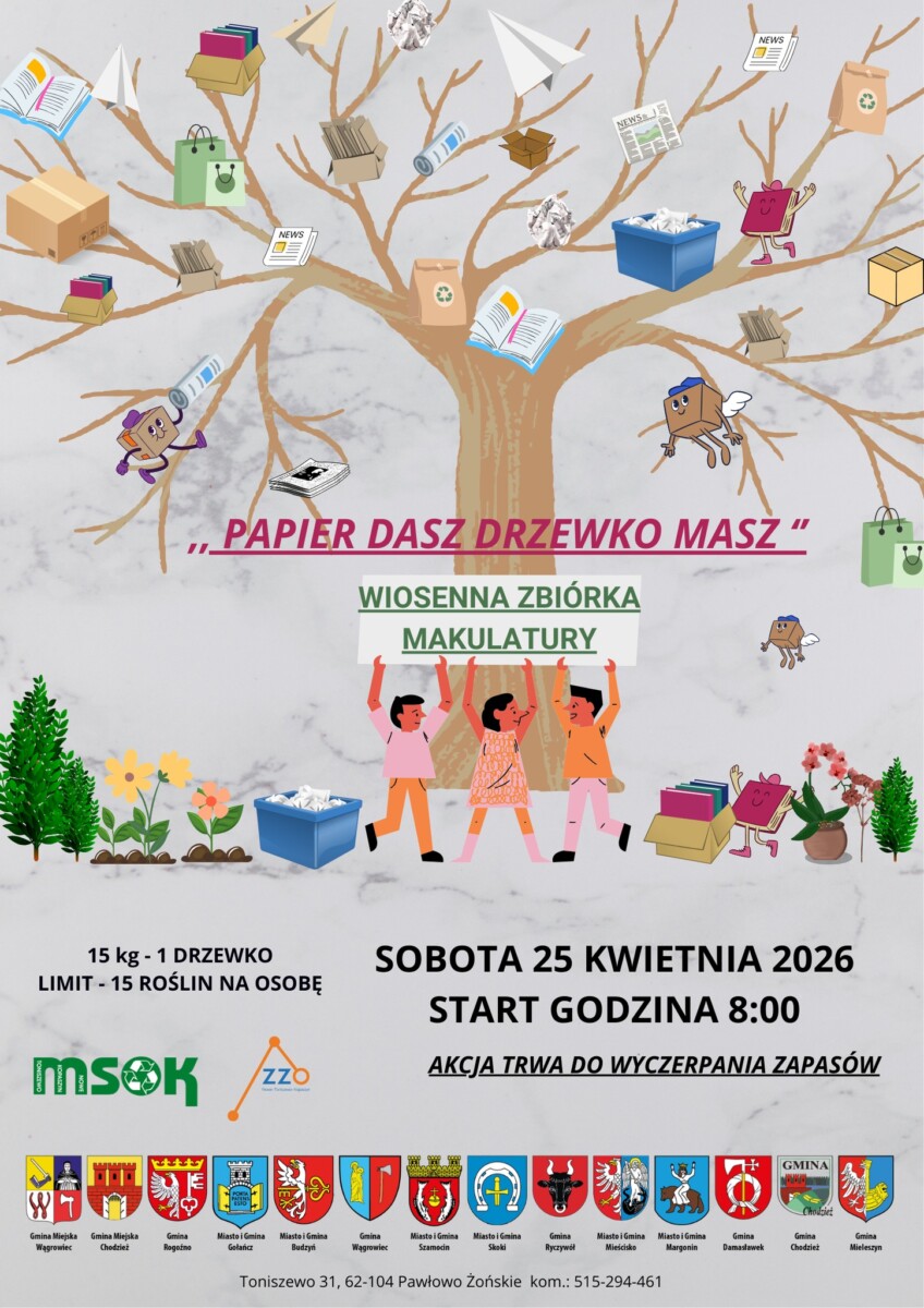 Wiosenna zbiórka makulatury pod hasłem „Papier dasz – drzewko masz” odbędzie się w sobotę, 25 kwietnia. Akcja rozpocznie się punktualnie o godzinie 8:00 i będzie prowadzona do wyczerpania zapasów roślin. Punkt zbiórki zostanie zlokalizowany w siedzibie spółki MSOK, w Toniszewie 31 (62-104 Pawłowo Żońskie).